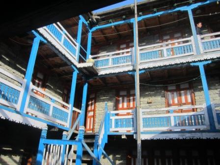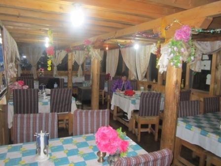 Bei unserem Spaziergang durch das Dorf fiel uns ein voller Speiseraum einer anderen Lodge auf. Drinnen gute Stimmung, lecker duftendes Essen und ein Schild am Eingang: Zimmer mit Bad: Neid! Da es aber hier so ueblich ist, das man auch dort isst, wo man uebernachtet (die Zimmerpreise sind entsprechend gering, der Umsatz wird mit dem Essen gemacht), trottelten wir wieder zu unserem Guesthouse zurueck: gaehnende Leere im grossen Speisesaal und leider auch das schlechteste Dhal Bat, das ich hier jemals hatte.