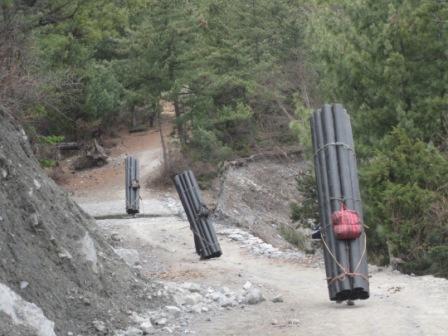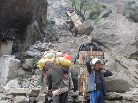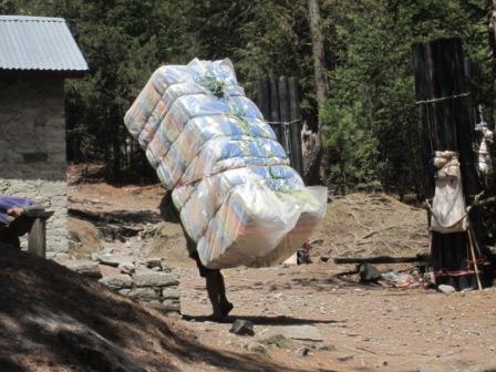 Faszinierend ist das Leben und der Handel hier. Viel wird mit Maultierkaravanen transportiert. Sehr haeufig sieht man aber auch die Sherpas, das traditionelle Volk der Traeger. Sie transportieren unglaubliche Lasten die Berge hoch, Getraenkekisten, Stahltraeger fuer die Bruecken, Abwasserrohre, Matratzen, Huehner und Schweine. Auch die Sherpas treffen wir immer wieder. Die gehen ungefaehr das gleiche Tempo wie wir – mit etwa zehn mal so viel Gewicht.