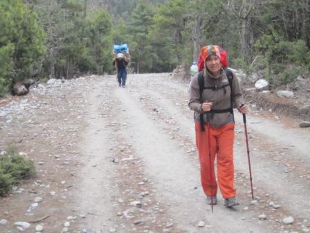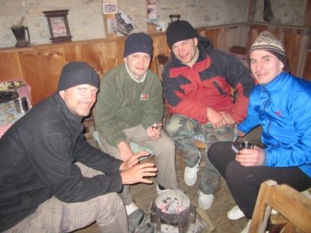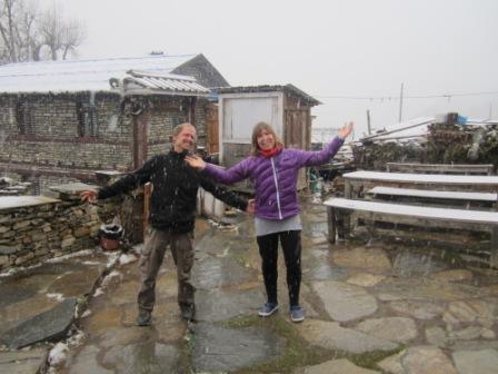 Heute wuerde ich die gesamte Bergwelt eintauschen wollen, gegen ein warmes Zimmer mit kuscheligem Bett und einer heissen Dusche. Von Sauna oder Massage will ich gar nicht sprechen. Wir haben uns von Upper Pisang noch mal 370 Hoehenmeter (natuerlich ging es vorher erst noch bergab ueber den Fluss) auf einem schmalen Pfad nach oben geschlaengelt. Trotz fussbreiter Schritte in Zeitlupentempo pocht der Kopf pocht, das Herz rast. Ich habe keine Luft zum Atmen. Dazu ist es noch bewoelkt und es gibt keine Sicht auf die Berge. Ich denke an das Gespraech mit Magnus (ein Trecker aus Schweden), der von einer 10-taegigen Schweigemeditation berichtete. An einem Tag war es ihnen fuer 2 Stunden komplett untersagt, sich zu bewegen. Seine Rueckenschmerzen, mit denen er sich seit langer Zeit herumplagte, steigerten sich so sehr, das er dachte er muesse sterben. Aber er hat durchgehalten, bis er die Schmerzen nicht mehr wahrnahm. Und welch Wunder, die Rückenschmerzen sind bis heute nicht wiedergekommen. Diese Disziplin ist bewundernswert. Und ich glaubte in diesem Moment an diesen paar Metern zu scheitern? Letztendlich sind wir am Zielort Ghyaru angekommen und sitzen in einem gemuetlichen Gastraum, der natuerlich eiskalt ist. Leider ist es, wenn überhaupt immer nur vormittags sonnig. Ab mittags zieht es zu, und es ist kalt und windig und meistens regnet es auch. Dann heisst es frieren, frieren, frieren. Dann doesen wir einem Fieberschlaf aehnlich in unseren Schlafsaecken. Wenn man Glueck hat, wärmt am Abend ein Kaminofen oder Feuer den Gastraum.