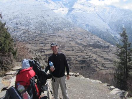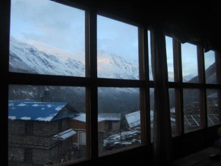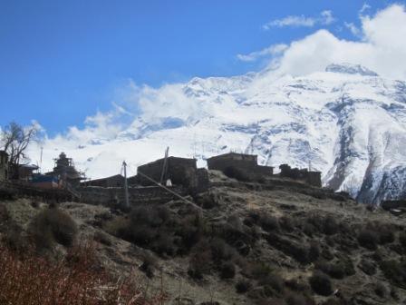 Nach diesem harten Tag nach Ghyaru und der bitterkalten Nacht wachte ich durch das Geraeusch von Schneeschippen auf. Die Sonne strahlte, und hinter dem Panoramafenster unseres Zimmers war die ganze Schoenheit der Bergwelt zu sehen. Trotzdem habe ich in dieser weiteren fast schlaflosen Nacht (Herzrasen und Atemnot nur beim Wenden im Bett und Dauerkopfschmerz) entschieden, das ich den Pass nicht gehen moechte. Ich habe die gesamten Bedingungen unterschaetzt und ich fuehle mich dieser Hoellen-Tour (an einem Tag von 4500 m auf 5500 m und direkt wieder Abstieg auf 3900 m) nicht gewachsen. Zu viel Respekt vor der Kaelte und Hoehe. Volker hat zum Glueck volles Verstaendnis dafuer und wir beschliessen gemuetlich bis nach Manang zu gehen. Es war noch ein herrlicher Tag. Auf einem Hoehenweg ging es durch traditionelle Gurung-Doerfer und nach Muji (3200 m).