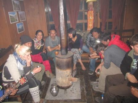 In der Lodge dort trafen wir auf eine Gruppe junger Leute aus Kathmandu, die einerseits dort ins neue Jahr hineinfeiern wollten (offizieller Neujahrstag ist in Nepal der 13. April) und andererseits auch eine Reise zu ihren Wurzeln machten. Die Eltern von dreien von ihnen kommen aus Doerfern in der Gegend. In einem der Doerfer leben mittlerweile nur noch zehn Menschen. Eine Tourismusstudentin aus der Gruppe fragte mich: „Welche Persoenlichkeit hat fuer dich die Annapurna – Region?“ Die Annapurna Region ist fuer mich eine extreme Persoenlichkeit. Es ist teilweise so kalt und die Bedingungen so hart, das man sich kaum vorstellen kann, wie Menschen hier ueberleben koennen. Frauen gehen jeden Tag mehrere Stunden mit Wasserkanistern, Teekesseln und kleinen Snacks steil bergauf, um am Wegesrand eine mobile Teekueche, eine Art „Truckstop“ fuer die Traeger und sonstiger Passanten aufzubauen. Alles muss mueselig oft tagelang zu Fuss nach oben getragen werden, durch Regen und Schnee, an den Füssen nur Gummischlaeppchen. Wenn es am Nachmittag kalt wird, gibt es nur eine Feuerstelle in der Kueche und die Berge wirken unheimlich und bedrohlich fuer alles Leben. Dann wiederum, wenn die Sonne scheint, ist die Bergwelt so wunderschoen. In den Doerfern ist Leben: Kinder, Ziegen Huehner, Hunde, alle sind froehlich. Die sind Eltern geduldig und super lieb zu ihren Kindern. Die Menschen sehen entspannt und gluecklich aus. Dann wirkt es wie der friedlichste Ort der Welt. All das ist die Annapurna Region.