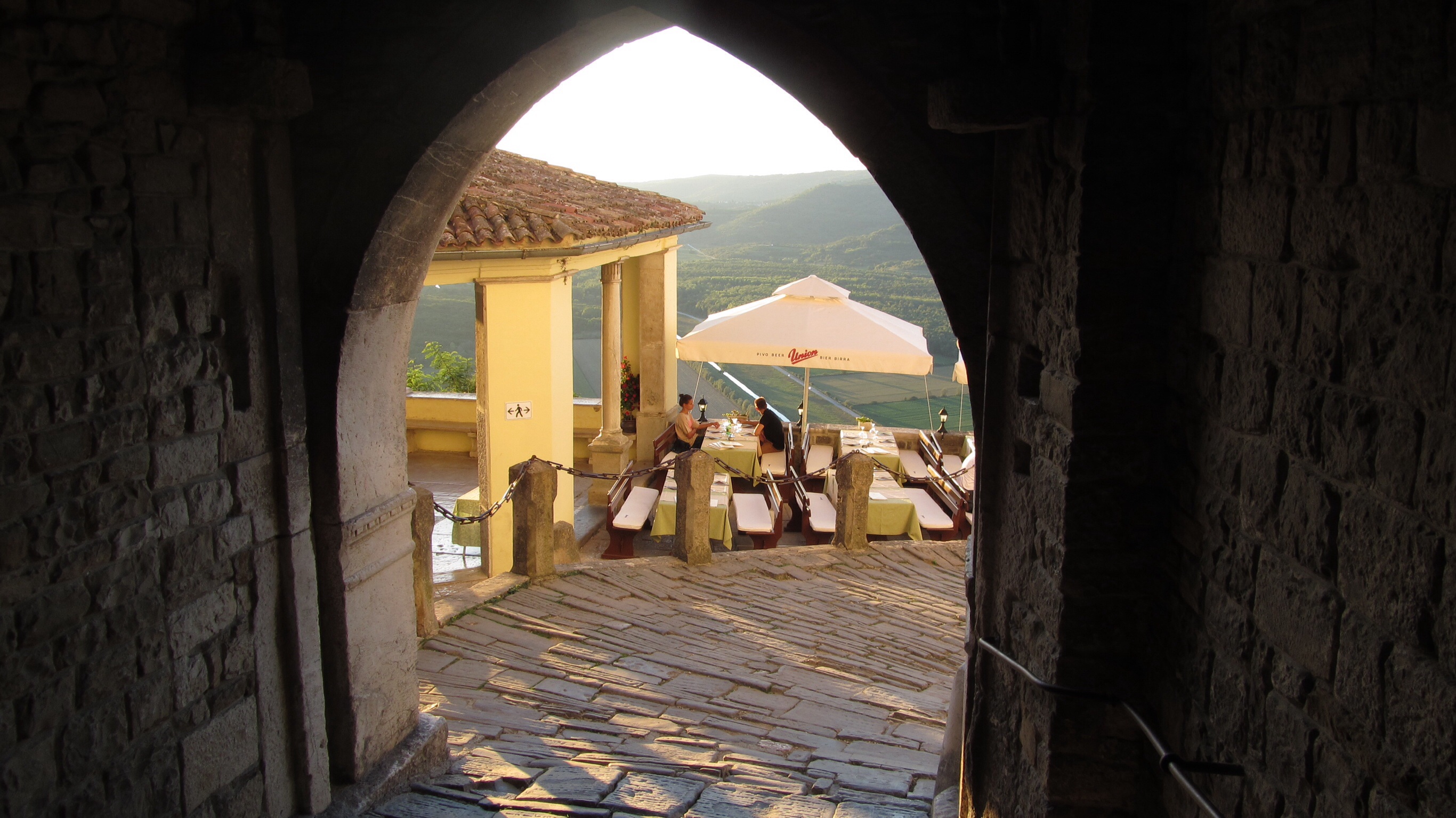 Die nächste Station unseres Ausflugs war Motovun, das sich sehr dekorativ mit seinen engen Gassen auf einem Hügel präsentiert. Rund um den Ort befinden sich die berühmten Eichenwälder mit dem begehrten Trüffel und hier haben wir ihn dann auch gegessen.