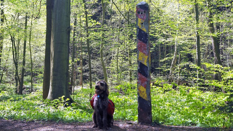 Vor dem ersten echten Testlauf haben wir Bobby ganz langsam erst an das Geschirr und dann an den Rucksack gewöhnt. Dabei ist uns schon aufgefallen, dass er sich wesentlich ruhiger und konzentrierter bewegte, als das bei ihm sonst der Fall ist. Am Feiertag letzte Woche ging es dann das erste Mal im Harz in den Praxistest. Die Tour war ca. 12 km lang und passierte abwechslungsreiches Gelände. Kurz die Tourdaten: Start war Stapelburg im ehemaligen deutsch-deutschen Grenzgebiet. Vom Parkplatz am alten Bahndamm ging es durch das Eckertal vorbei an einem Grenzpfeiler und durch die historische, aus Kaiserzeiten stammende Badeanstalt, dem „Jungborn-Gelände“.