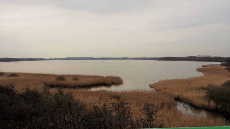 Dann verließen wir den Park und wanderten eine kleine Runde durch das Naturschutzgebiet zum Hemmelsdorfer See, in dem übrigens der tiefste Punkt Deutschlands liegt (39 Meter unter Normalnull). Da hatte Bobby allerdings erneut etwas zu meckern. Den knapp 15 Meter hohen Aussichtsturm „Herrmann-Löns-Blick“ bestieg ich ohne ihn. Er wartete unten mit Wolfgang. Dass ich mich alleine ohne seinen Schutz in diese Höhen wagte, das gefiel ihm gar nicht und er beschwerte sich lautstark.
