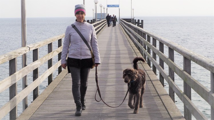An der Leine auf der Seebrücke sieht Bobby sehr entspannt aus. Es ist wie bei kleinen Kindern, man muss nur auf sie eingehen, schon läuft’s 😉