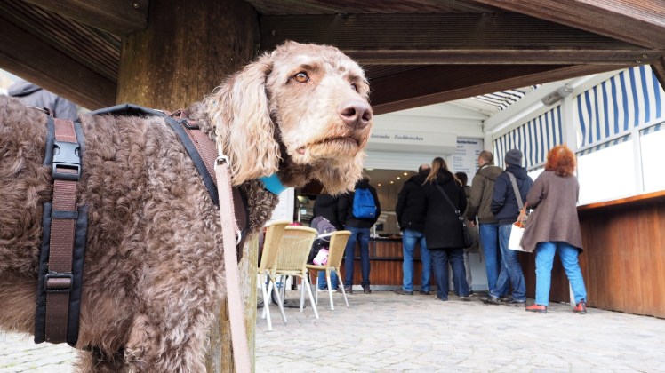 Wieder glücklich vereint führte uns die kleine Rundwanderung zum Niendorfer Hafen, der als kleiner Fischereihafen richtig Charme hat. Am Imbissstand der Klüvers Hafenräucherei gab es dann endlich unser hart verdientes Fischbrötchen. Am Nachbartisch bemerkten wir schon das Interesse an Bobby und die so oft gestellte Frage kam: „Was ist denn das für eine Rasse? Jagdhund? Deutsch Drahthaar?“ Das vermuten tatsächlich viele, auch Pudelpointer ist immer mal dabei. „Nein, Labradoodle“ – „Ah, diese Allergiker-Hunde. Aber Jagdtrieb hat er schon, oder? Das sehe ich in den Augen.“ sagte der Herr aus der Gruppe und sein Blick wurde ganz sehnsuchtsvoll. „Dieser besondere wache Blick! Toll!“ Und wie als ob Bobby ihm etwas beweisen wollte, sprang er mit einem lauten Wuff in die Leine – eine Ente watschelte über die Wiese. Der Herr schmunzelte wissend in sich hinein. Er sah in Bobbys Augen den Blick seiner ehemaligen Hündin – eine Jagdhündin – wie er uns im weiteren Gesprächsverlauf berichtete. Bobby hatte einen neuen Freund. All mein Ärger über Bobby war verflogen. In dem Moment dachte ich nur ganz stolz: Ja das ist unser Bobby!
