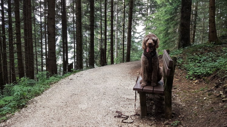 Wir verlassen den See und machen uns auf zu einer kleinen Rundwanderung Richtung Halsalm. Ein deftiger Anstieg führt durch den angenehm schattigen Wald. Hier ist Bobby wieder in seinem Element. Alles hat seine Ordnung. Keiner hat mehr Puste für Sprünge abseits des Weges. Wolfgang geht vorne weg mit Bobby, dicht gefolgt von Max und ich schnaufend hinterher. Ab und zu schaut Bobby sich um, ob ich noch da bin. Für ihn ist die Welt wieder in Ordnung.