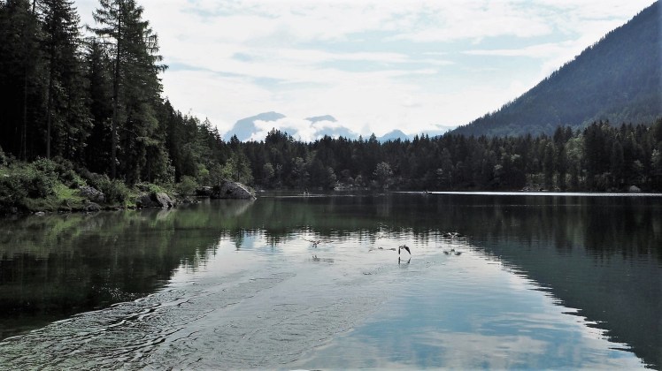 Wir sind am Hintersee im Berchtesgadener Land, einen Steinwurf von Salzburg entfernt. Das Wetter zeigt sich unentschlossen. Wolkig? Sonnig? Oder wird es sogar noch ein Gewitter geben? Und gerade diese Uneindeutigkeit zaubert eine besondere Stimmung in den Zauberwald am Rande des Hintersees bei Ramsau. Etliche Touristen (-busse) sind auch schon unterwegs. Na klar, was für ein schöner Ort!