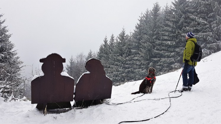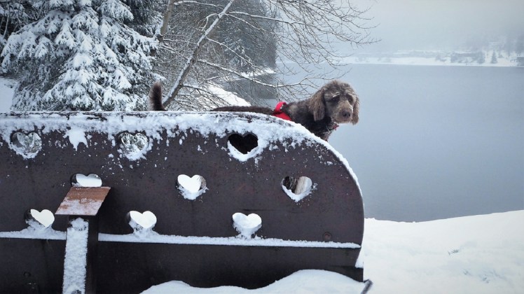 An unserem Startpunkt in Auerhahn hatten wir keine Mühe, den Weg zu finden. Und auch auf der gesamten Strecke war kein Verlaufen möglich. Wegweiser und rote Herzen markieren perfekt den Weg. Bobby schwebte wie auf Wolke sieben über den Schnee.