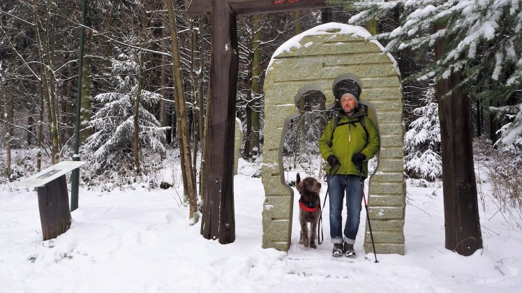 Etliche Liebesbänke später im aufziehendem Nebel erreichten wir unseren Ausgangspunkt Auerhahn, wo wir direkt die gleichnamige vermeintliche Gaststätte ansteuerten. Wir traten in den warmen Vorflur. Duft von Kaffee und Feuerholz drang uns entgegen. „Wollen Sie auf den Weihnachtsflohmarkt?“ fragt ein freundlicher Herr, bestimmt der Wirt. „Äh, nein ins Restaurant“ sagten wir und wollten an ihm vorbei drängeln, so verführerisch gemütlich schien es in der vor uns liegenden Stube zu sein. „Da sind Sie fünf Jahre zu spät. Das ist mittlerweile ein Privathaus und wir machen heute einen Flohmarkt.“ Ach wie schade. Weihnachtsflohmarkt und schneenasser Bobby verträgt sich nicht so gut.