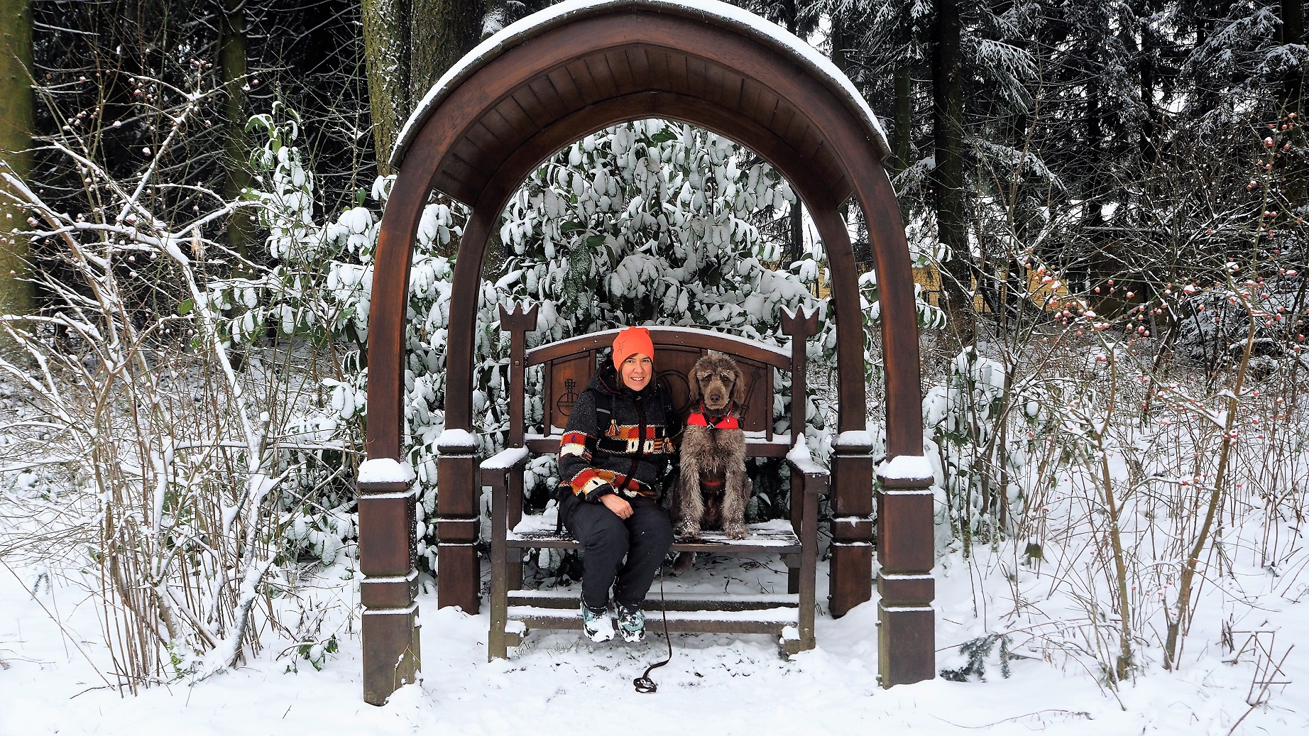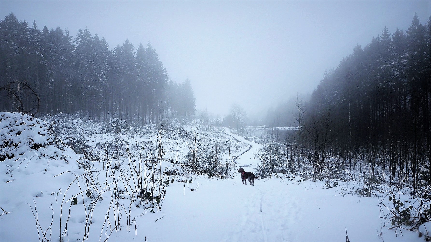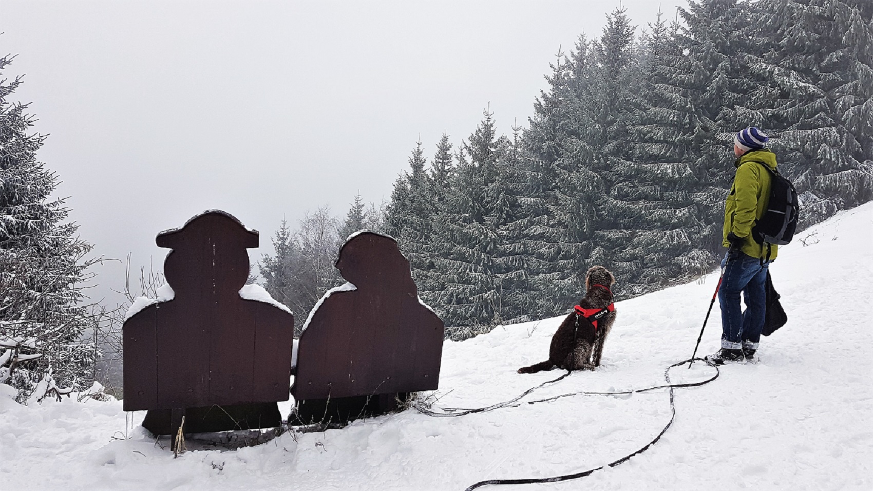 Etliche Liebesbänke später im aufziehendem Nebel erreichten wir unseren Ausgangspunkt Auerhahn, wo wir direkt die gleichnamige vermeintliche Gaststätte ansteuerten. Wir traten in den warmen Vorflur. Duft von Kaffee und Feuerholz drang uns entgegen. „Wollen Sie auf den Weihnachtsflohmarkt?“ fragt ein freundlicher Herr, bestimmt der Wirt. „Äh, nein ins Restaurant“ sagten wir und wollten an ihm vorbei drängeln, so verführerisch gemütlich schien es in der vor uns liegenden Stube zu sein. „Da sind Sie fünf Jahre zu spät. Das ist mittlerweile ein Privathaus und wir machen heute einen Flohmarkt.“ Ach wie schade. Weihnachtsflohmarkt und schneenasser Bobby verträgt sich nicht so gut.