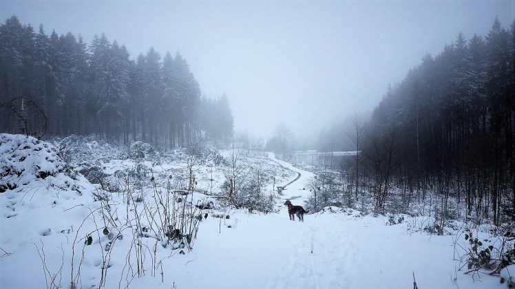 Ehrlich gesagt hatte ich von diesem Weg schon vorher gehört. Die Beschreibung „sehr schöner Spazierweg auch für Kinder gut geeignet“ hatte mich immer abgeschreckt. In meiner Übersetzung hieß das „langweilige Runde auf breiten Forstwegen und viel Arbeit für Bobby, all die Kinder in Schach zu halten und für mich wiederum viel Arbeit, Bobby in Schach zu halten“. Unter den derzeitigen Wetterbedingungen weckte diese Beschreibung allerdings die Hoffnung auf ein wenig Romantik in dieser kalten, grauen Zeit, sowie auf einigermaßen gut begehbare Wege trotz Schnee.