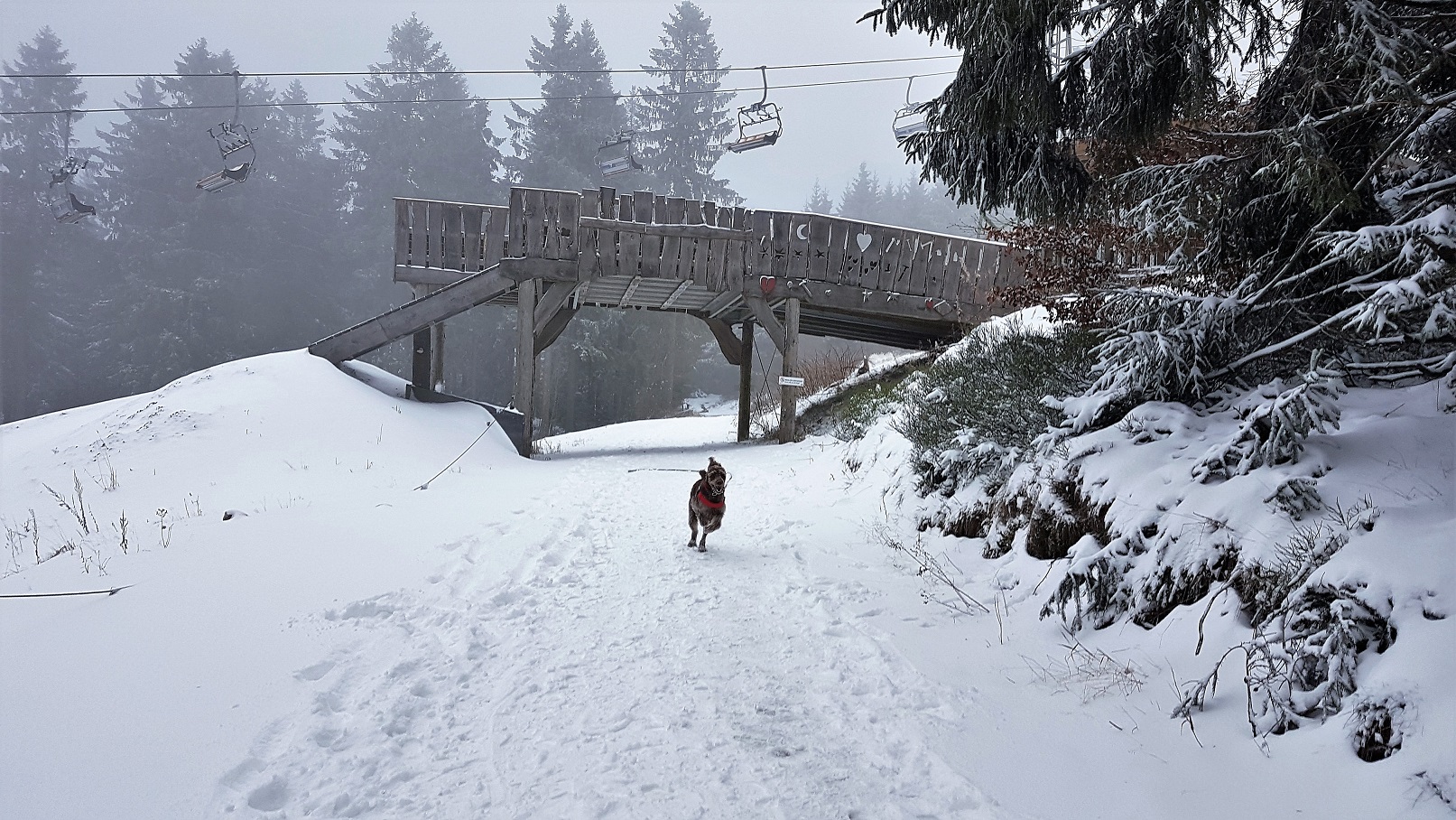An unserem Startpunkt in Auerhahn hatten wir keine Mühe, den Weg zu finden. Und auch auf der gesamten Strecke war kein Verlaufen möglich. Wegweiser und rote Herzen markieren perfekt den Weg. Bobby schwebte wie auf Wolke sieben über den Schnee.