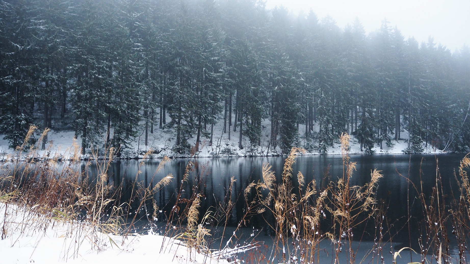 Gleich zu Beginn passierten wir etliche Teiche des Oberharzer Wasserregals. Der Himmel war wie immer grau, aber der Schnee schluckte die Geräusche und wir genossen die unterschiedlichen Blicke und den abwechslungsreichen Wegverlauf.