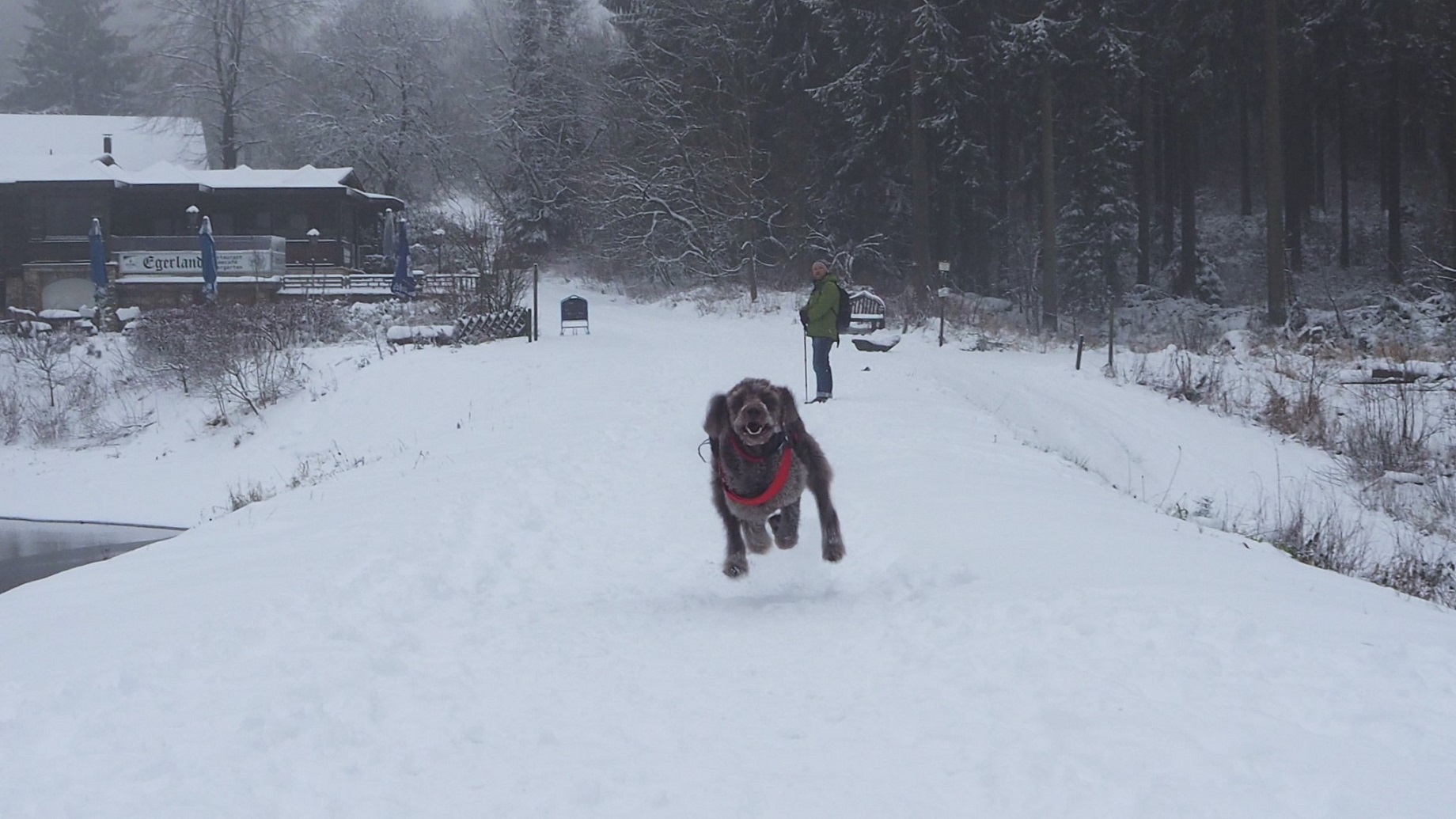 Bobby war bestens drauf. Er folgte ausschließlich den menschlichen Spuren auf den schneebedeckten Wanderwegen und machte keine Anstalten, einen Rehbraten für das Abendessen zu erlegen. Die Belohnung dafür: Freilauf, mit dem er verantwortungsvoll umging. Immer wieder wartete er auf uns und versicherte sich, dass wir ihm folgen.
