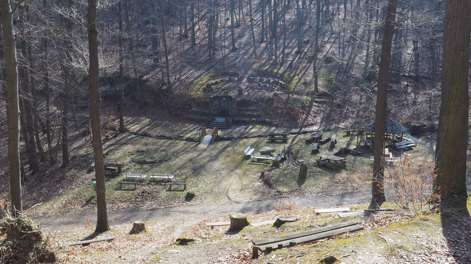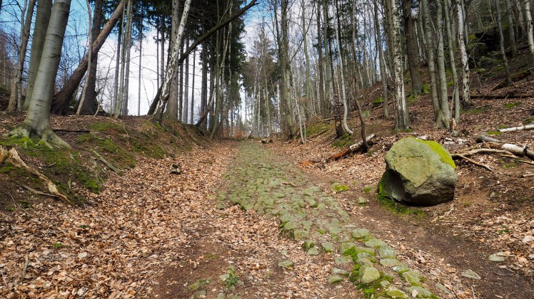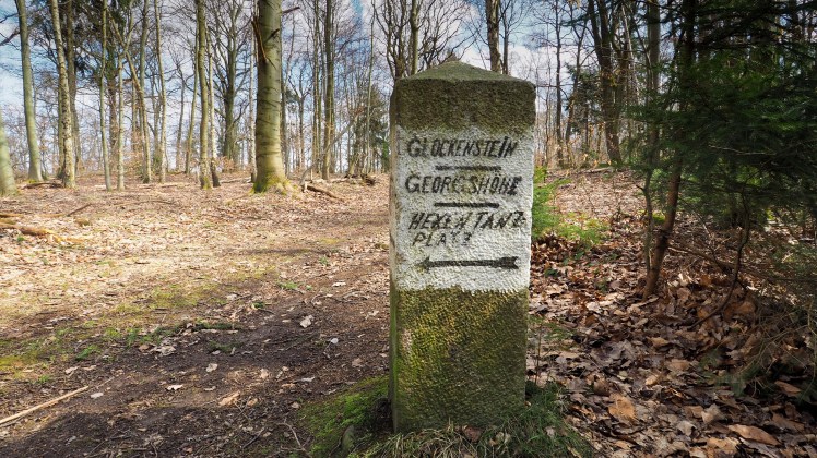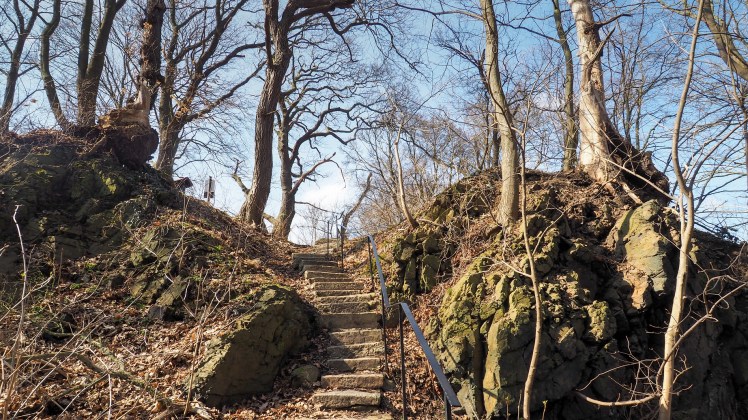 Von der Lauenburg steigen wir bis ins Wurmbachtal ab, das wir aber bald wieder über den Bergmannstieg verlassen. Gerade begleiteten uns links und rechts des Weges noch dunkle Klippen. Wir befinden uns in historischem Steinbruchgebiet. Doch mit jedem Höhenmeter wird es sonniger und der Wald lichtet sich.