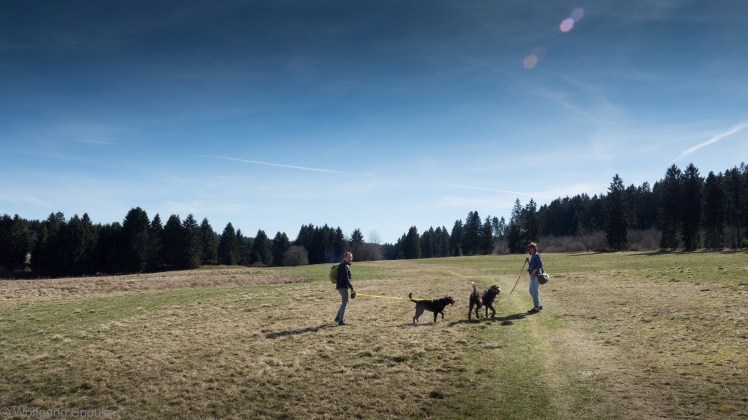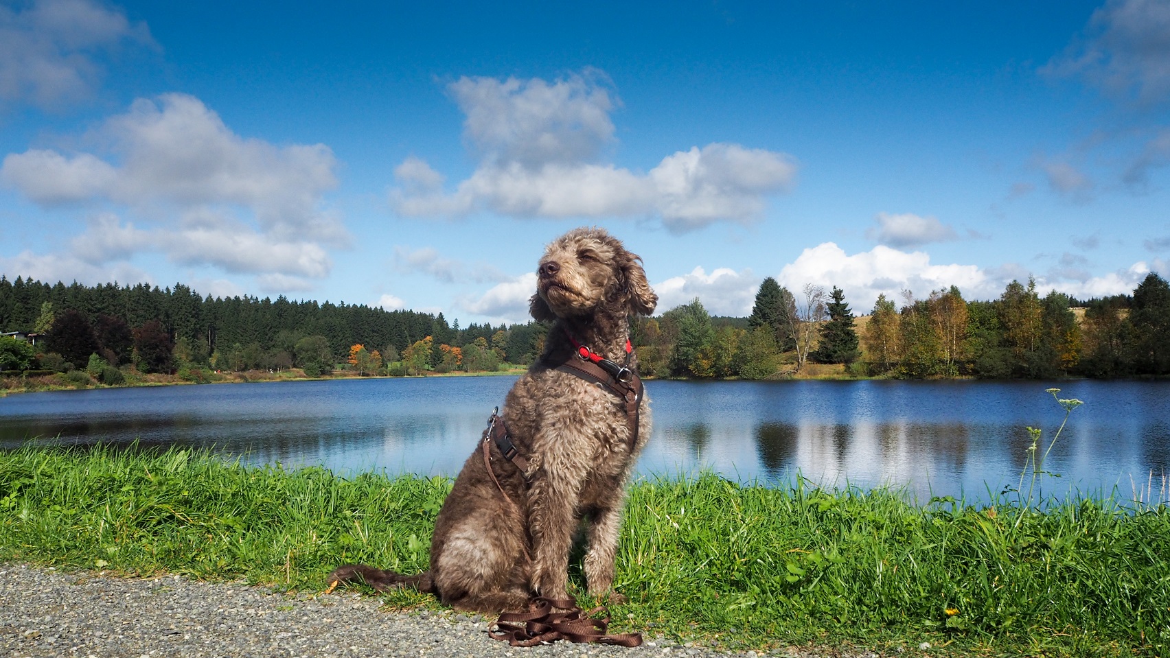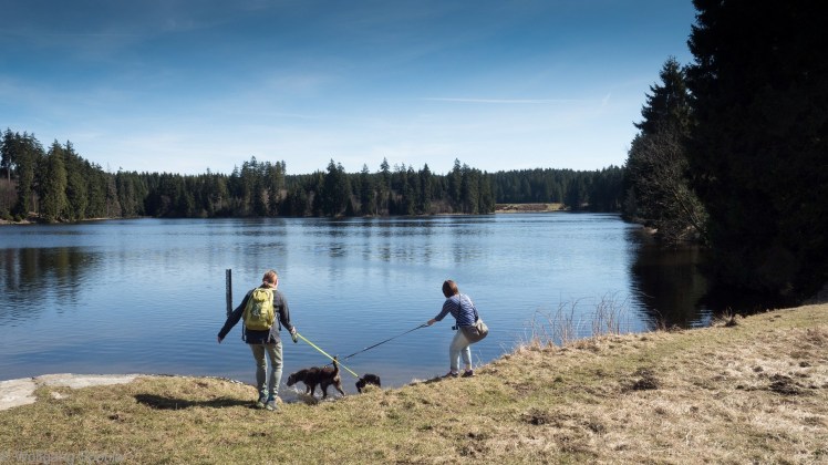 Dieses Jahr ist es anders. Wir haben Zuwachs bekommen. Die mittlerweile acht Monate alte Labradorhündin von Alex soll auf ihre erste Wanderreise gehen. Bei Buntenbock im Harz laufen wir bei strahlendem Sonnenschein entlang der Teiche des Oberharzer Wasserregals. Wir haben so dermaßen Glück mit dem Wetter und die Gegend ist traumhaft schön. Die kleine Lotta genießt das Leben und will am liebsten die ganze Welt gleichzeitig entdecken. Bobby ist hin und her gerissen: Nervt das Gewusel oder macht es einfach einen riesen Spaß, die Gelegenheit zu nutzen, mal richtig die Sau rauszulassen? Bobby entscheidet sich für Zweiteres. Aufgrund der Brut- und Setzzeit ist in Niedersachsen Leinenpflicht und selbstverständlich halten uns brav daran. Ohne Vorwarnung meint Bobby mit einem riesen Satz in den Buntenbocker Teich springen zu müssen. Die Leine zwirbelt über meine Handfläche. Zu spät lasse ich los. Ich stolpere hinterher. Fast wäre ich mit einem Bauchklatscher im See gelandet. „Nein, ich bevorzuge wärmere Temperaturen für ein Bad,“ entgegne ich unserem Publikum und muss trotz Schmerzen in Hand und Schulter auch lachen.