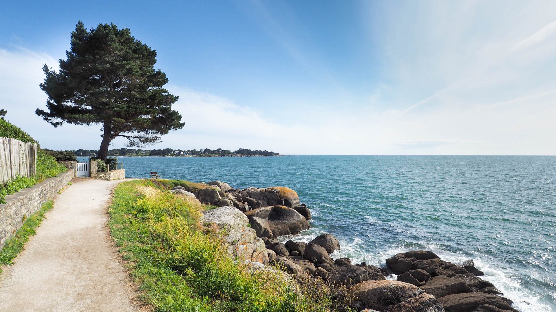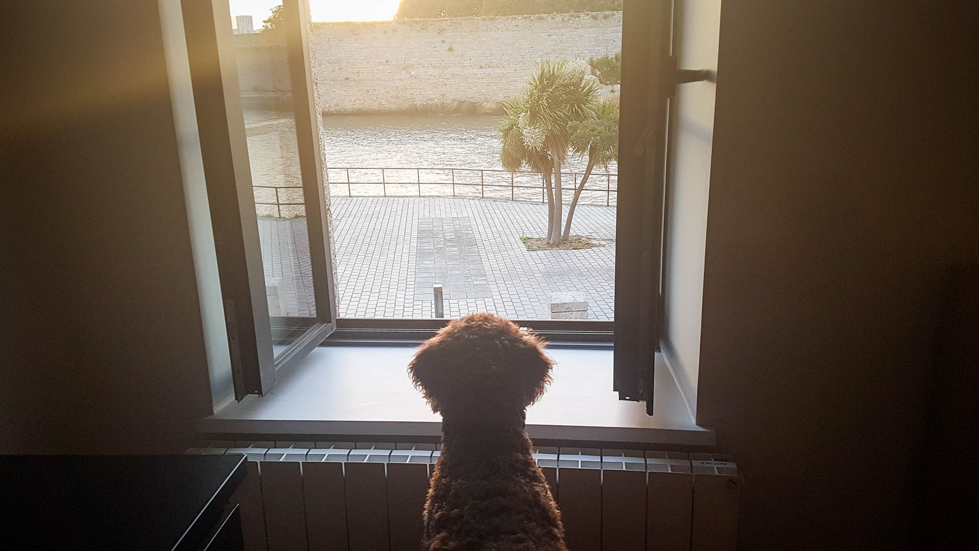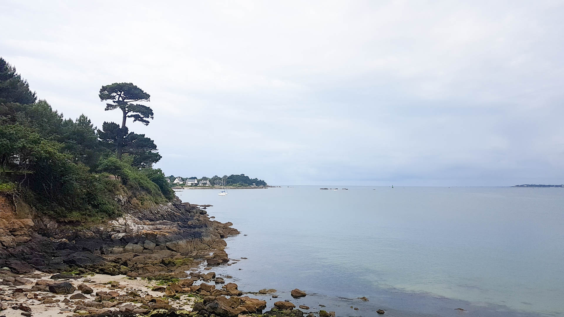Das Ferienhaus war genau so schön wie auf den Fotos – der Blick von dort auf den Hafen und die Mauern der Ville Close, ebenso wie die moderne Einrichtung des alten Stadthauses. Aber das Beste wartete direkt vor der Haustür – der Zöllnerpfad. Fast 2000 Kilometer könnte man auf diesem Wanderweg entlang der gesamten Küste der Bretagne weiter gehen – immer mit Blick auf das Meer. Der Zöllnerpfad (auch GR 34 genannt) wird uns noch während unseres gesamten Aufenthaltes in der Bretagne begeistern, aber nun waren wir erst einmal auf unserer ersten Gassirunde in Concarneau. Entlang von schmucken Wohnhäusern durch einen lichten Kiefernwald gingen wir bis zur nächsten Bucht. Viele sind hier mit Hund unterwegs, die meisten ohne Leine. Bobby musste sich ab und zu mal aufregen. Aber meistens unterlag er dem Charme seiner französischen Artgenossen und blieb außergewöhnlich höflich und gelassen. Bretagne mit Hund – das könnte richtig gut zusammengehen.