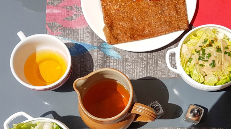 „Cinquante Centilitres Cidre, s’il vous plait.“ Diese wichtigen Worte hatte ich bereits gelernt. Die Kellnerin verstand mich und brachte die Karaffe Cidre mit zwei Teetassen. Wunderbar. Bei dem Versuch, uns die Speisekarte zu erklären, musste sie sich dann Hilfe beim englisch sprechenden Chef holen. Überaus freundlich erklärte er uns die verschiedenen Größen der Gallettes aus „blé noir“ (Buchweizen) und verwies darauf, dass man sich aus allen Zutaten auch individuell etwas zusammenstellen könne. Ich bin zwar keine Vegetarierin, fragte aber nach einer vegetarischen Variante. Er zeigte auf das mit Ei, Champignons, Zwiebeln und Tomate. Noch war ich unentschlossen und sagte „Non“, um noch mal selbst die Karte zu studieren. Ich las unter anderem „Andouille bretonne fromage“ – eine Auswahl bretonischer Käse kann das nur heißen – lecker, das nehme ich. Wolfgang sagte noch: „Schau doch bei Google, was das heißt.“ „Ich will jetzt einmal nicht mein Handy herausholen“ entgegnete ich und wir bestellten – Wolfgang das vom Chef empfohlene Gallette, ich meine eigene Auswahl.