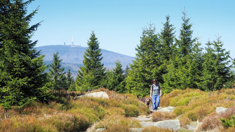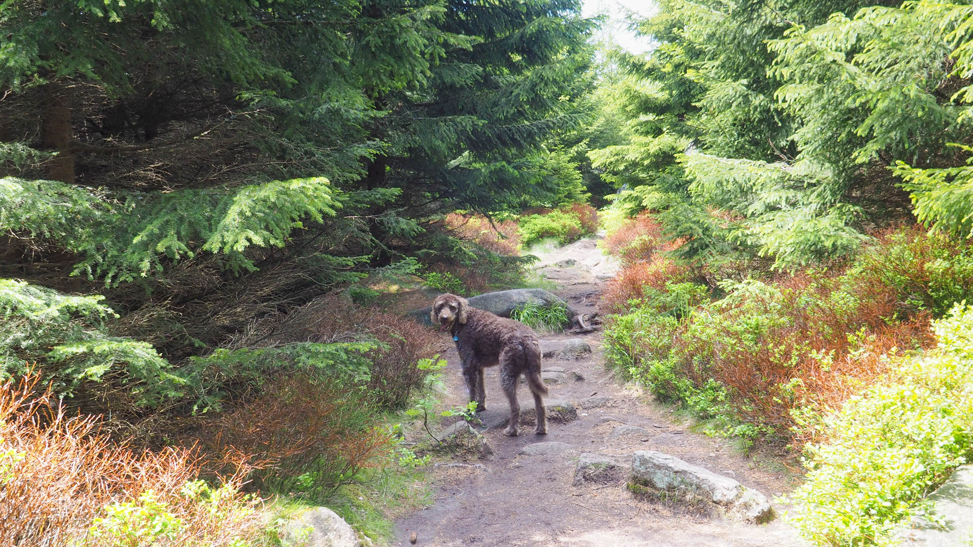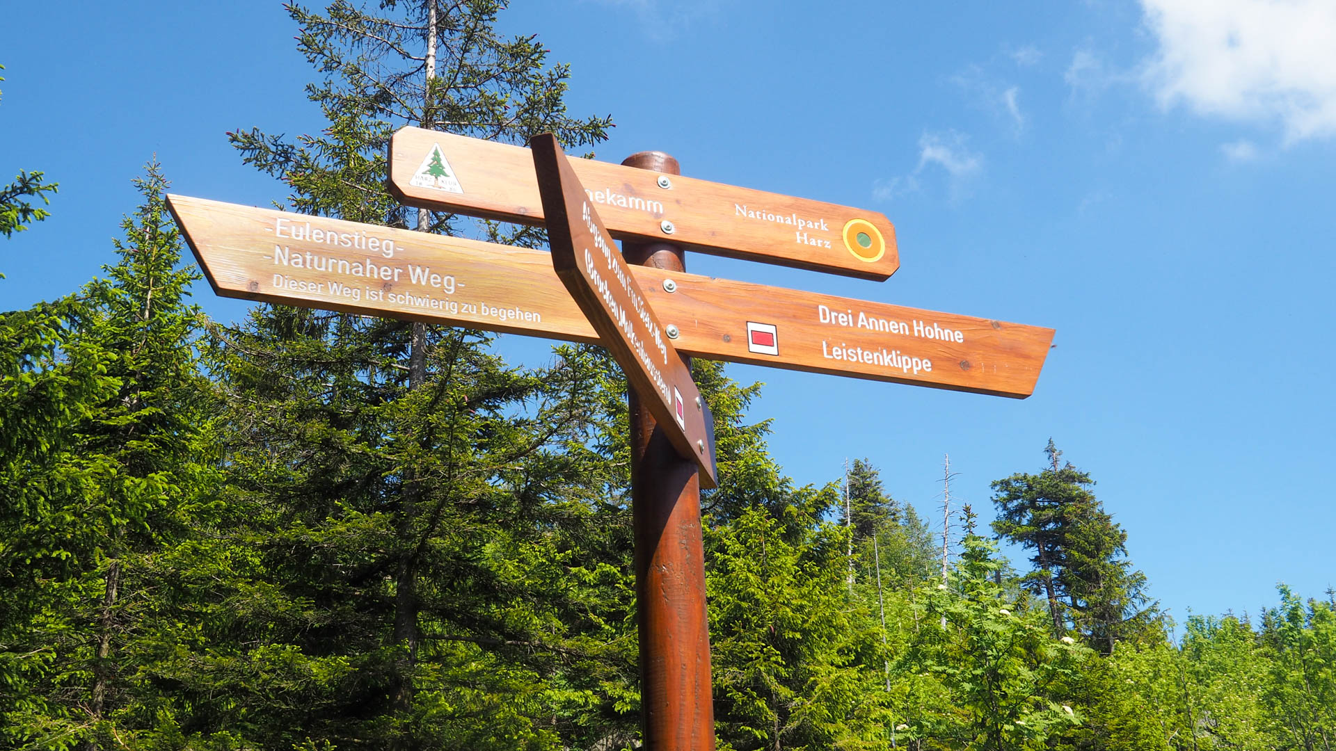 In Drei Annen Hohne starteten wir unsere Tour auf dem Löwenzahn Entdeckerpfad. Eigentlich meide ich ausgewiesene Erlebniswege, wenn ich mit Bobby unterwegs bin, da er auf unberechenbare Kinder sehr ungehalten reagieren kann. Aber dieser Naturerlebnispfad ist richtig schön angelegt und anscheinend regt er tatsächlich zu ruhigem und konzentriertem Erforschen und nicht zu wilder Action an, so dass Bobby hier noch nie etwas zu meckern hatte. Auch Volker und ich studierten verschiedene Tierspuren, versuchten uns im Waldmemory und hörten mit den Ohren einer Eule. Bis zum Trudenstein, eine Stempelstelle der Harzer Wandernadel, ging es auf breiten Wegen bergan. Ab und zu überholten uns E-Mountainbiker mit lockerem Tritt. Am Trudenstein angekommen, wartete ich mit Bobby unten, während Volker den kleinen Aussichtsfelsen bestieg. Danach wollte ich ebenfalls hinauf. Mittlerweile hatte allerdings eine größere Gruppe den Felsen belagert. Jeder wollte ein Selfie mit jedem und dann noch mal vor jeder Aussicht in jede Richtung. Ich wartete ein paar Minuten auf der ersten Plattform, dann gab ich auf. Ich wusste, dass mich an diesem Tag noch bessere Ausblicke erwarten würden. Während wir auf einer Bank noch etwas tranken und einen Müsliriegel aßen, zog die Gruppe fröhlich quatschend weiter. Ich hoffte insgeheim, dass sie dem breiten Forstweg weiter folgen und nicht wie wir auf den steilen Pfad Richtung Leistenklippe abbiegen würden.