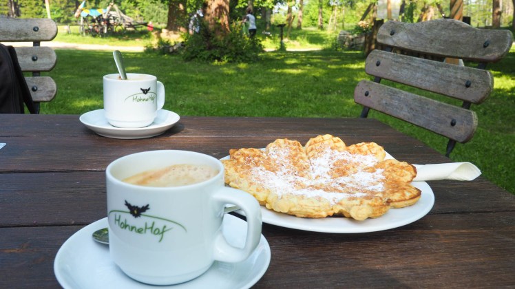 Im Hohnehof angekommen, duftete es nach Waffeln und wir hatten Glück. Mittlerweile war es halb fünf und das Naturerlebniszentrum schließt um 17:00 Uhr „Wir haben nicht mit so einem Ansturm gerechnet“, sagte die Dame am Tresen. „Ich habe nur noch Teig für eine Waffel. Ansonsten gibt es nichts mehr zu essen“ Der Hohnehof hatte den ersten Tag nach der Corona bedingten Schließung wieder geöffnet. Volker und ich freuten uns über die letzte, extra dicke Waffel und dass es nun nur noch ein paar hundert Meter bis zum Auto waren. Schön war es. Und auch mein Bruder war begeistert, wobei sein Stempelheft immer noch blank ist. Das hatte er nämlich zu Hause vergessen.