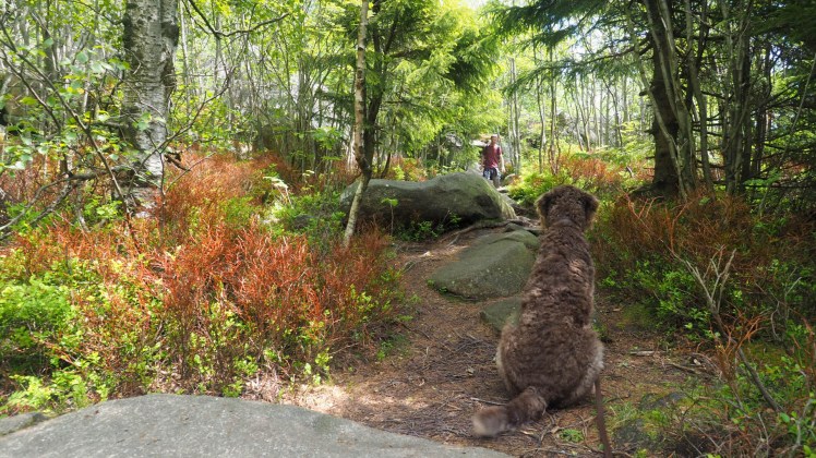 Auf dem Eulenstieg weist ein roter Punkt und das Symbol einer Eule den Weg, wo auf den ersten Blick gar keiner zu sein scheint. Aber tatsächlich schlängelt er sich durch eine Wildnis aus riesigem Wurzelwerk, Totholzstämmen, jungen Fichten, Heide- und Moosgewächsen, kleineren Felsformationen. An einigen Stellen ließ ich Bobby von der Leine, damit er selbständig entscheiden konnte, wie er den Weg meistert. Er ist mittlerweile so geschickt und weiß genau, ob er Hindernisse besser drunter, drüber oder außen herum bewältigt. Zwischendurch verlor ich das GPS – Signal, was mich immer etwas nervös macht. Aber wir hörten nun schon wieder die Stimmen der Gruppe und dann sahen wir vor uns auch einen Wegweiser, der die Abzweigung links hoch zur Landmannklippe zeigte. Wir überlegten kurz und Volker sagte: „Wir hatten heute doch schon so viele schöne Ausblicke.“ Eigentlich hatte ich auch keine Lust mehr, wieder aufzusteigen und ich brauche ja auch einen Grund, nochmal hierher zu kommen. Also ließen wir die Landmannklippe hinter uns liegen, und auch die Wandergruppe hörten und sahen wir an diesem Tag nicht mehr wieder.