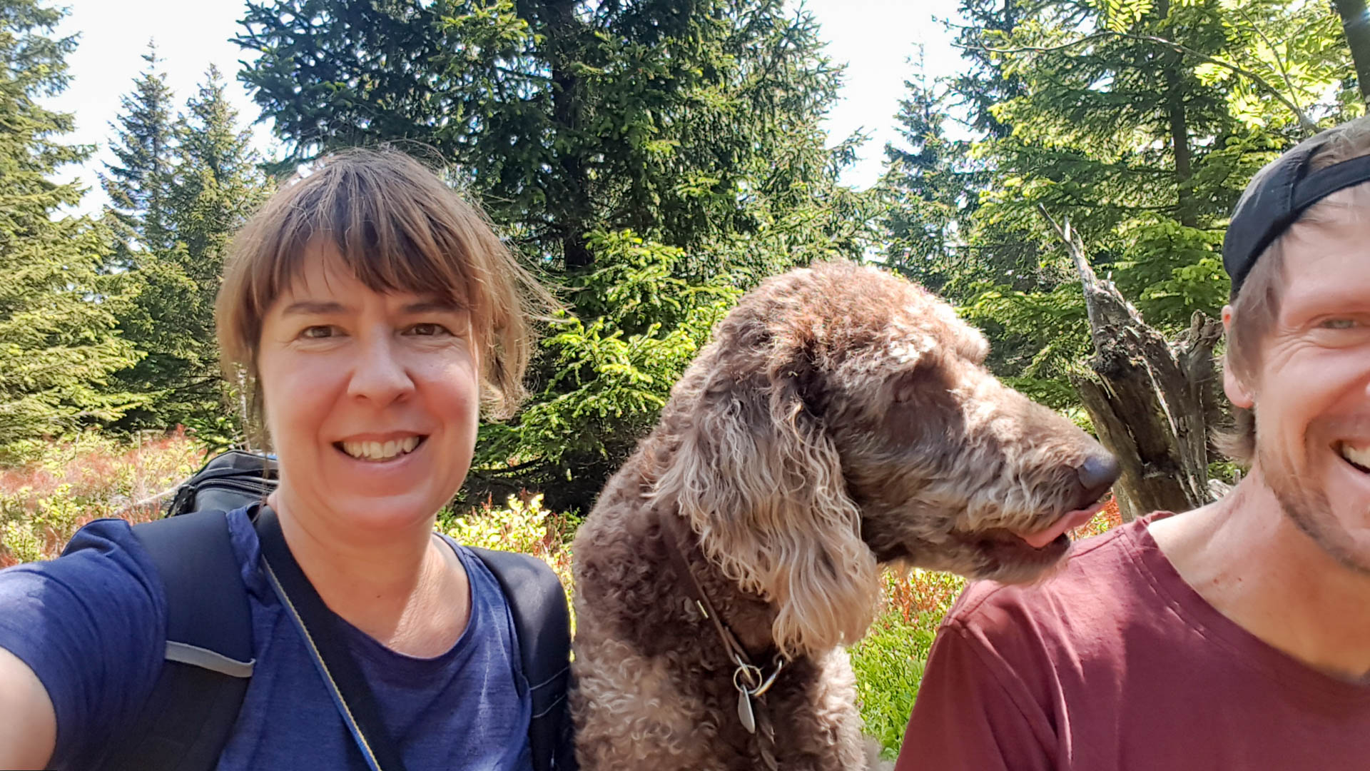 Wir waren an der Abzweigung zum Eulenstieg angekommen und hier war dann auch unser (fast perfekter) Jausenplatz. Ich wollte ein Selfie mit Volker machen. Es ist einfach schön, mit ihm gemeinsam zu wandern. Auch wenn wir das sehr selten machen, ist da eine Vertrautheit und Leichtigkeit, die es vielleicht nur unter Geschwistern gibt. Als ich das Handy in Position brachte, drängelte sich Bobby zwischen uns. Er wollte unbedingt mit aufs Foto mit seinem geliebten Volker, den er aber erst mal gründlich abschlecken musste.