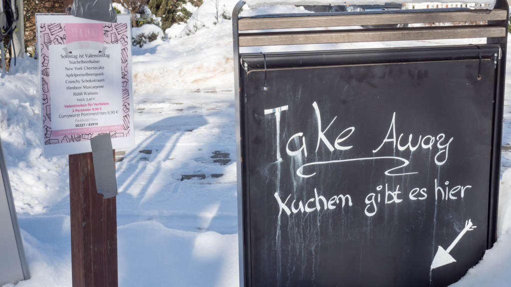Wir überqueren den Campingplatz, um dann wieder in den Wald einzutauchen, wo wir ein Wassertretbecken passieren (super Erfrischung im Sommer!). Weiter geht es auf dem Karstwanderweg (der tatsächlich geräumt wurde!) Richtung Bad Grund. Ich mag dieses kleine, verschlafene Bergbaustädtchen. Am Ortsausgang weckt das Café Flora mit einem Schild unsere Aufmerksamkeit: „Take Away – Kuchen gibt es hier“. Kurze Zeit später steht Wolfgang mit einer Tortenbox, Sekt und einer Rose vor mir – die „Valentinsbox für Verliebte“ – ach, das auch noch, heute ist ja Valentinstag – wahrlich eine Achterbahnfahrt der Gefühle …