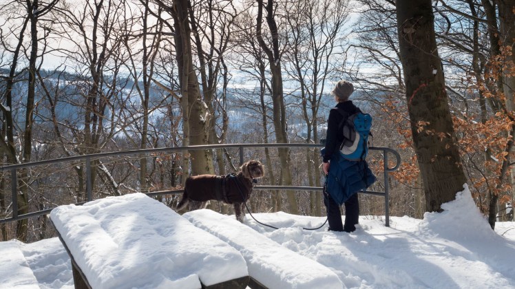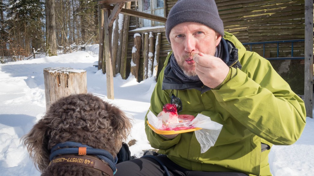 Wir erreichen die Gaststätte Iberger Albertturm, eine meiner Lieblingsgaststätten auf einer meiner Lieblingsrunden im Harz. Rustikal, aber sehr liebenswert und irgendwie eigenwillig, gibt es hier leckeren selbstgebackenen Kuchen, Windbeutel und je nach Saison Bärlauchwurst oder Grünkohl mit Bregenwurst – alles vom Harzer Wild (nicht nur Bobby liebt Wild!). Keine Straße führt hier hoch. Es ist eine reine Wandergaststätte und doch hat sie zuverlässig Sommers wie Winters auf, sogar während des Corona-Lockdowns – natürlich ausschließlich für den Außer-Haus-Verkauf. Perfekt! Der Kaffee zu unserem Valentins-Tortenpaket ist gesichert!
