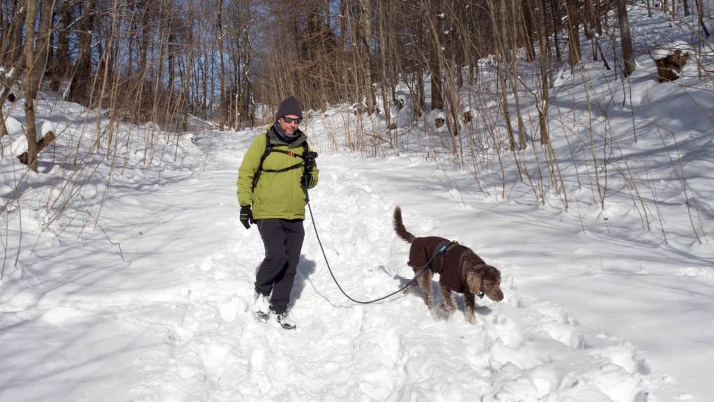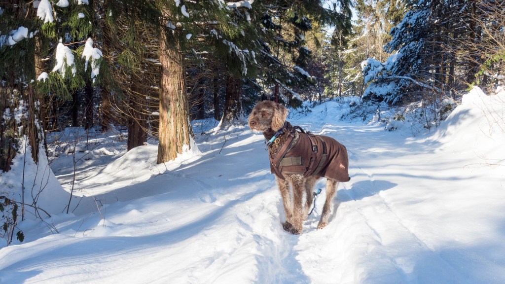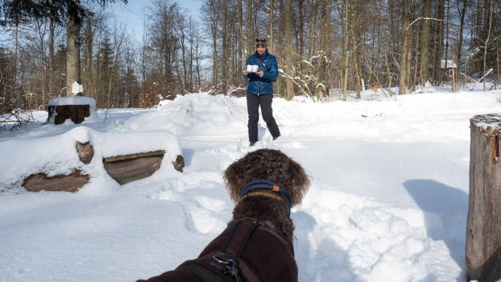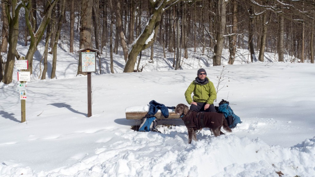 Hin und her gerissen zwischen Erleichterung, dass alles gut gegangen ist, Ärger über meine eigene Dummheit und gleichzeitig Enttäuschung über Bobby, der mich nach jahrelangem Antijagdtraining so dermaßen ignoriert hat, ist meine Laune im Keller. Nach einer Tasse Tee und dem Hinweis von Wolfgang, dass das Wetter und der Schnee doch ein Traum wären, komme ich wieder einigermaßen zu mir und verwerfe den Gedanken, die Wanderung hier und jetzt abzubrechen. Aber zwischen Bobby und mir liegt noch was in der Luft.