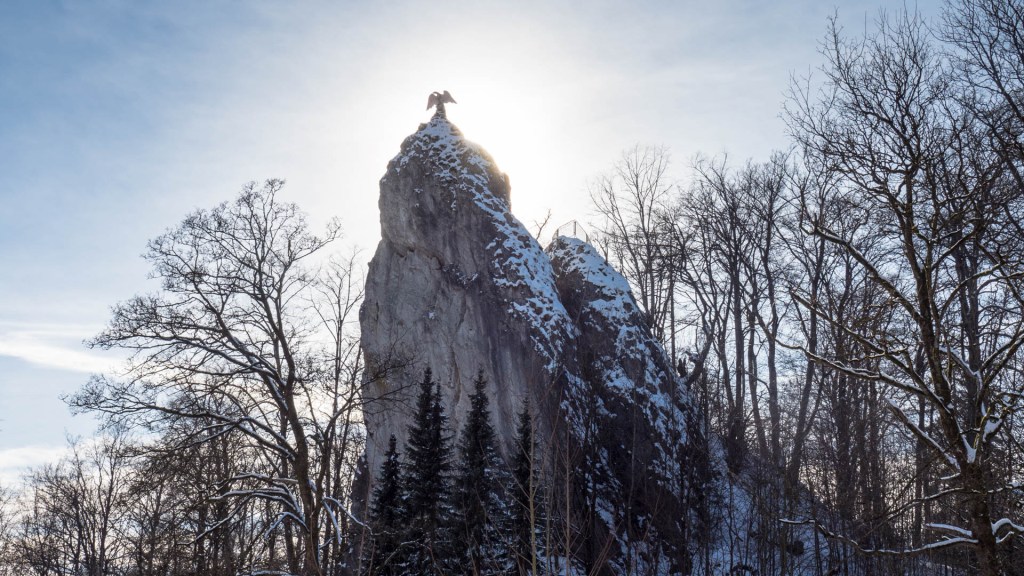 Ohne einen Grund für diese Wegsperrung zu erkennen, erreichen wir nach etwa einem Kilometer den Hübichenstein, der mit seinen markanten Kalkfelsen und dem mächtigen Bronzeadler auf seinem Gipfel im Gegenlicht vor uns steht. Voller teilweise noch unverarbeiteter Erlebnisse (ich blicke zu Bobby, der gerade intensiv die im Schnee ebenfalls deutlich sichtbaren Spuren anderer Hunde auf dem Parkplatz untersucht) und wunderbaren Momenten (die Rose hat die Wanderung bis zum Ende überlebt) kann ich sagen, dass diese Wanderung nicht nur eine Lieblingsrunde von mir, sondern auch eine perfekte Winterwanderung im Harz ist. Die Wege waren alle sehr gut ausgetreten oder wie beispielsweise große Strecken des Karstwanderweges sogar geräumt. Diese Runde wird in der Tat nie langweilig. Spätestens im Frühjahr zur Rhododendronblüte im Weltwald und zur Bärlauchblüte am Iberg sehen wir uns wieder. Und dann bekommt Bobby auch eine Wurst vom regionalen Wild – in der Gaststätte am Iberger Albertturm – damit er nicht mehr selber jagen muss 😉