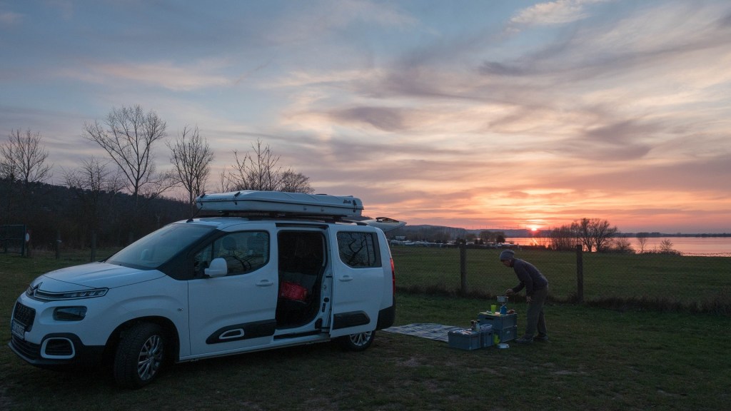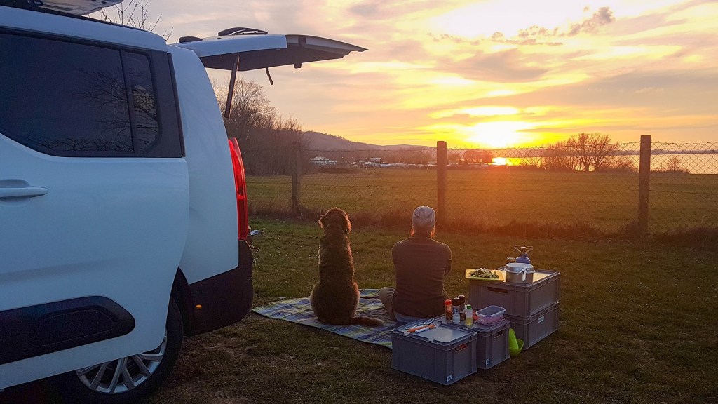 Auf der Serpentinen Straße runter ins Tal sehen wir einen See vor uns liegen. Wir folgen den Schildern: Richtung Stausee Kelbra und finden den perfekten Platz für ein Abendessen. In wenigen Minuten ist unsere mobile Küche aufgebaut und pünktlich zum Sonnenuntergang lassen wir uns den Reis mit Gemüse und einen Cidre aus der Dose schmecken. Dieser Ort wäre ebenfalls ein geeigneter Platz zum Übernachten. Gerade ist auch hier ein Wohnmobil angekommen. Aber ich will nicht. Wir fahren die 130 Kilometer wieder nach Hause. Dennoch: Das wunderbare Gefühl von Freiheit bleibt – was für ein Luxus.