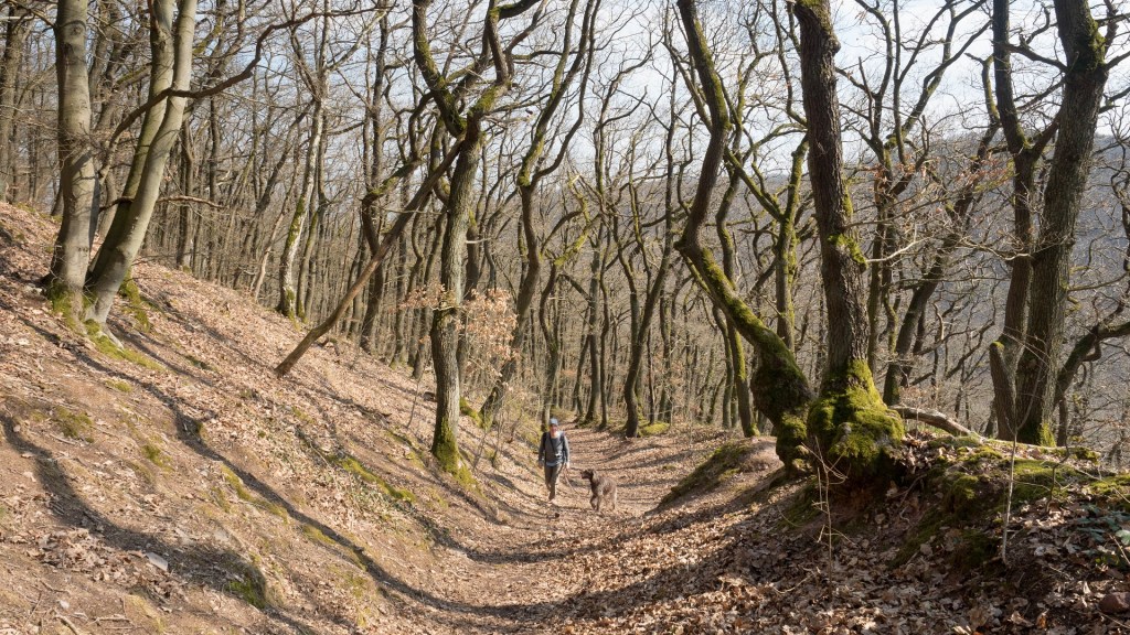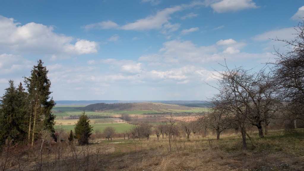 Von der Burg aus folgen wir einem Hohlweg bergab durch urwüchsigen Laubmischwald und blicken bald über Streuobstwiesen Richtung Harz. Von Frühling ist noch nicht viel zu sehen, obwohl es bereits Ende März ist. Kein Grün und keine Blüte ist an den Bäumen zu finden. Auch ist es nicht so warm, wie ich mir das erhofft hätte. Ich denke kurz an die geplante Nacht im Dachzelt und frage mich, ob es eventuell etwas zu kalt dafür sein könnte. Nun geht es wieder stetig bergauf durch den Wald, der wenig Abwechslung bietet. Vielleicht nehme ich deswegen umso stärker das laute Gezwitscher der Vögel wahr. Die unterschiedlichsten Geräusche sind zu hören. Immer wieder flattern auch kleine und größere Vogelschwärme vor uns auf. Ich bin nicht so ein Fan von reinen Waldwanderungen. Ich liebe die Weit- und Ausblicke. Aber gerade genieße ich diese Kulisse sehr.