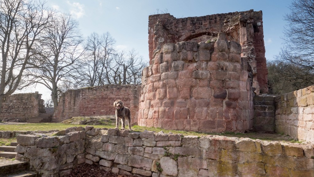 Kurze Zeit später stehen wir vor (coronabedingt) verschlossenen Toren. Die mächtigen Absperrungen und der große Einlassbereich deuten auf jede Menge Besucher zu normalen Zeiten hin. Selbst der Außenbereich des Kyffhäuser Denkmals ist weiträumig abgeriegelt. 8,50 Euro würde die Besichtigung kosten. Wir folgen dem Kyffhäuser Wanderweg unterhalb des Denkmals Richtung Unterburg, eine mittelalterliche Burganlage, die für den Bau dieses riesigen Monumentes teilweise abgetragen wurde. Hier lässt es sich wunderbar zwischen alten Mauerresten herumstromern – Bobby liebt das. Wie ein kleines Kind springt er auf jeden Mauervorsprung und rennt jede Treppe ganz nach oben, um dann ganz stolz zu uns herunterzuschauen.