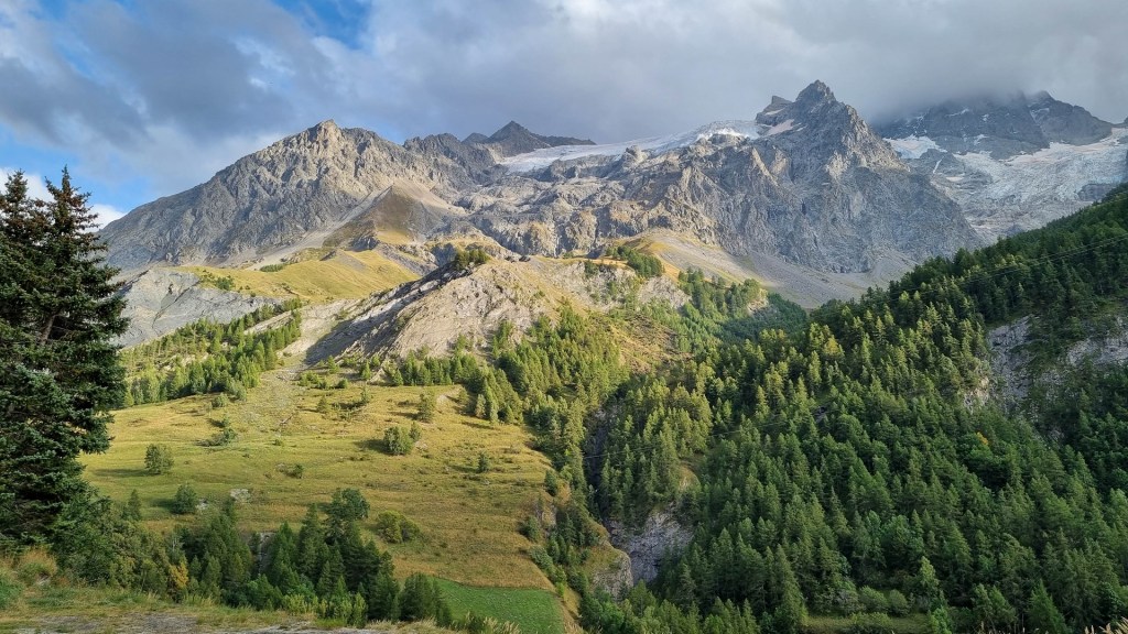 Kurz vor Briancon bei Le Monetièr-les-Bains fanden wir einen Campingplatz mit dem vielversprechenden Namen „Les 2 Glaciers„. Es war ein „Camping Municipal“, die meist recht günstig sind und sich oft an besonders schönen Orten in der Natur befinden, ohne viel Schnickschnack wie Swimming Pool, Animation oder Kinderspielplatz. Der Check In war unkompliziert, unser erstes kurzes französisches Gespräch lief mit fast vergessenem Schulfranzösischkenntnissen einwandfrei und der Stellplatz mit Blick auf die Berge und die Gletscher war großartig.