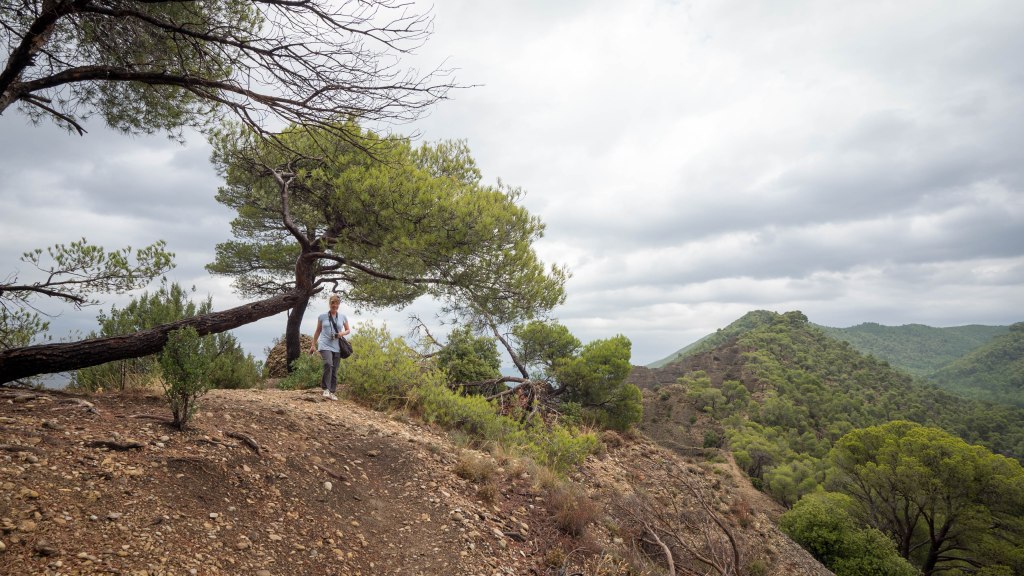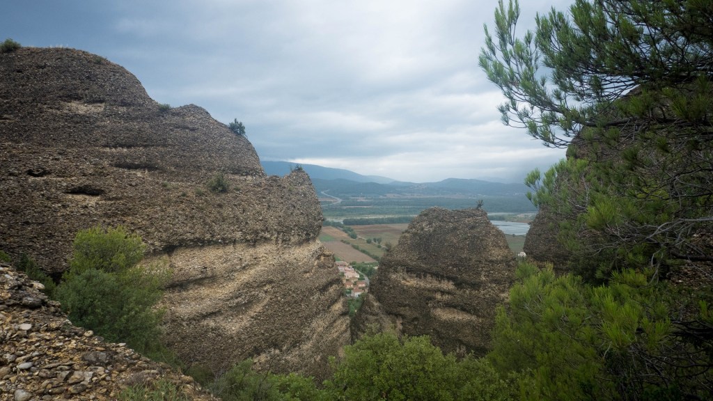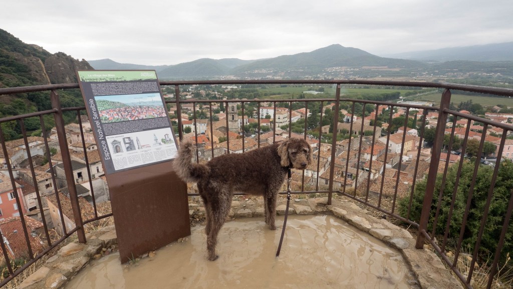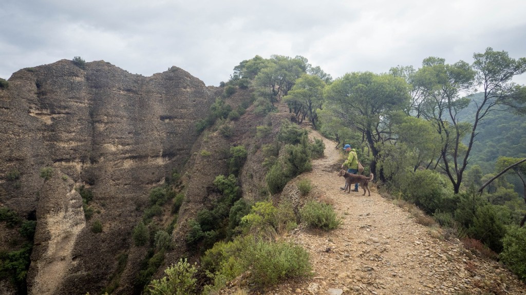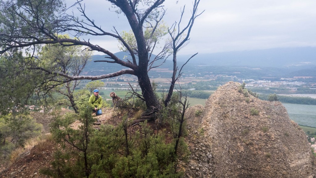 Und es hörte erst mal nicht auf, zu regnen. Wir beschlossen, den schnellsten Weg Richtung Verdon Schlucht zu nehmen. Wir fuhren ohne anzuhalten, vorbei an dem bei schönem Wetter bestimmt sehenswerten Stausee Lac de Serre-Ponco, ebenso wie an Sisteron, das pittoresk zwischen den Felsen klebt und eigentlich auch auf meiner Liste stand. Nun waren wir tatsächlich auch geografisch in den Seealpen angekommen und sahen nichts als Regen. In Lees Mees hielten wir an. Es war Zeit für eine Pause. Auf dem großen Besucherparkplatz standen wir vor der örtlichen Sehenswürdigkeit, den „Pénitents des Mees“, einer einzigartigen Gesteinsformation, die mit ihren aufragenden Felsspitzen an die Mützen von Mönchen erinnern soll. Aber was soll ich sagen? Es regnete immer noch in Strömen. Ich erkundete die Schautafeln und die Wandermöglichkeiten über diese etwa ein Kilometer lange und über 100 Meter hohe bizarre Felsformation und als wir überlegten, nach einer kurzen Pinkelpause direkt weiterzufahren, hörte es auf zu regnen und wir gingen einfach drauf los – durch die Gassen des Dorfes und dann immer höher hinauf über einem wahrlich spektakulären Kammweg durch die spitzen Mönchsmützen und vorbei an knorrigen, vom Sturm gebeugten Bäumen. Fünf Kilometer war der Rundweg insgesamt lang, Bobby hatte großen Spaß, denn der Charakter der schmalen Wege war beinahe hochalpin, so wie er das liebt und wir auch.