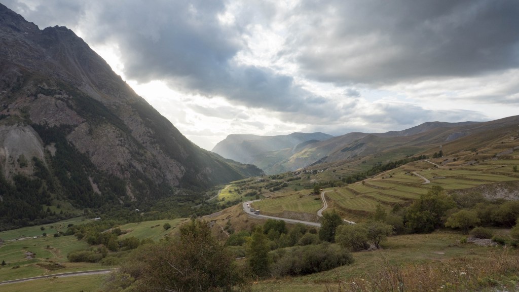 Als wir Chaminox verließen, wurde es immer diesiger und grauer. Am Nachmittag passierten wir Grenoble, dann die Abzweigung zur berühmten Bergetappe der Tour de France nach Alp d’Huez und irgendwann stellten wir uns die Frage, wo wir eigentlich übernachten sollten. Die Straße schraubte sich nun immer höher hinauf und die Wolken rissen immer weiter auf. Um uns herum tat sich eine Bergwelt auf, die so anders aussah, als das was ich bisher von den Alpen kannte. Eine Landschaft aus terrassenartig angelegten, saftig grünen Hängen, hinter denen sich mächtige Felsmassive erhoben, die von Gletschern und Schneefeldern übergossen schienen, lag vor uns. Der Höhenmesser im Auto zeigte über 2000 Meter an und die Berge um uns herum ragten weit über uns hinaus. Das Tal dazwischen war licht und weit, beinahe wie eine Hochebene. Ich fühlte mich an Nepal erinnert und spürte eine ähnliche Überwältigung und Ehrfurcht bei dem Anblick, wie ich es im Himalaya erlebt hatte. Hier irgendwo wollten wir bleiben.
