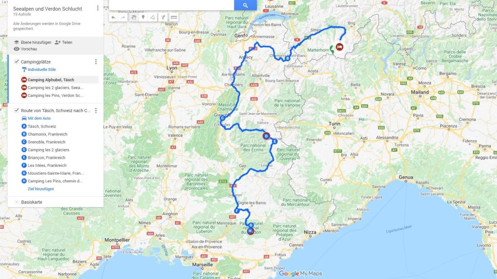 Der Tag am Matterhorn war fantastisch. Bei sommerlichen Temperaturen genossen wir während unserer Wanderung auf dem 5-Seen-Weg das grandiose Bergpanorama. Aber die Abende brachen Mitte September schon früh an, und dann wurde es kalt auf dem Campingplatz in Täsch bei Zermatt auf etwa 1500 Metern. Mir war danach, möglichst schnell in den Süden Frankreichs zu fahren. Wir googelten Wegstrecken und studierten Wetter Apps, die viel Regen für die nächsten Tage voraussagten. Wir hatten noch fünf Tage im Dachzelt vor uns, bis wir in Cassis (bei Marseille) angekommen sein sollten, wo wir für eine Woche eine Ferienwohnung angemietet hatten. Von den französischen (See-)Alpen über die Verdon Schlucht nach St. Tropez und dann weiter nach Cassis (so unser grober Plan) diskutierten wir die Fürs und Widers der Routen und Möglichkeiten. Wir kamen zu keinem Entschluss oder besser: Wir beschlossen, nichts zu beschließen, sondern über Chamonix (einmal einen Blick auf den Mont Blanc werfen) über Grenoble Richtung Süden zu fahren und zu schauen, wie weit wir kommen und wonach uns sein wird.