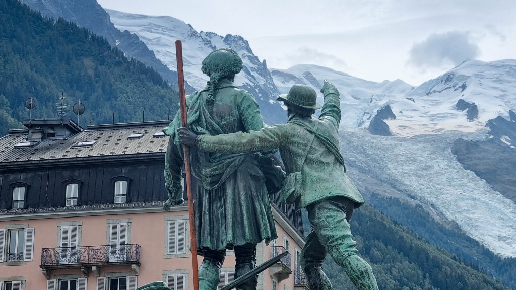 Bis Chamonix hielt das Wetter und während unseres Stadtbummels durch die Innenstadt, vorbei an altehrwürdigen Gebäuden und mondänen Hotels und durch innerstädtisches Gewusel blickten wir ähnlich wie in Täsch auf der Suche nach dem Matterhorn immer wieder in die Richtung der schneebedeckten Berge und der gewaltigen Gletscherzunge, die sich beeindruckend beinahe bis an die Stadtgrenze von Chamonix erstreckt. „Wo ist der Mont Blanc?“ Irgendwann kaufte ich eine Postkarte mit beschrifteten Gipfeln. „Ach, der Buckel da?“ Der Mont Blanc, mit 4807,73 m der höchste Berg der Alpen, ist weit unspektakulärer als das etwa 400 Meter „kleinere“ Matterhorn.
