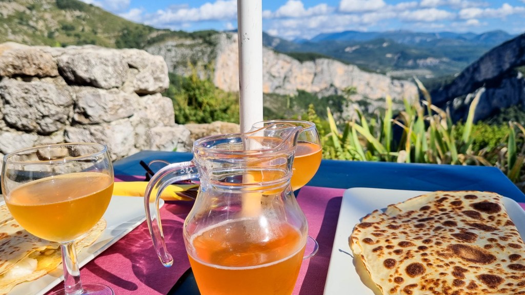 Gegen Mittag schlenderten wir nach Les Salles-sur-Verdon. Als der Stausee in den 70er Jahren gebaut wurde, musste das Dorf 400 Meter weiter nach oben versetzt werden. In der Touristeninformation wollten wir uns über Wandermöglichkeiten in der Verdonschlucht informieren. Wir standen vor verschlossenen Türen. Das ist Frankreich. Alle Geschäfte (zumindest in den kleineren Ortschaften) haben konsequent von 12 Uhr bis 15 Uhr Mittagspause. Und so machten wir es wie Alle. Wir gingen essen. Während das übrige Dorf ruhte, waren die wenigen Restaurants rund um den Hauptplatz der kleinen Fußgängerzone voll. Und beinahe auf jedem Tisch stand ein kleines Fläschchen Wein, auch bei uns. So geht das wohl, das „Savoir-vivre“ – wunderbar!