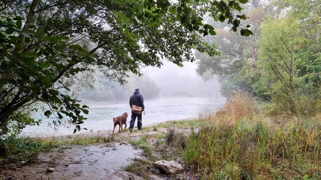 Es regnete tatsächlich noch einmal in der folgenden Nacht, und am nächsten Tag war der große Stausee Sainte Croix in milchigen Dunst gehüllt. Diffus konnte man die Sonne dahinter erahnen. Um zur nahegelegenen Verdonschlucht zu kommen, hätten wir das Auto bewegen müssen. Aber wir blieben unserem Vorsatz treu, nach einem Reisetag das Auto für mindestens 24 Stunden stehen zu lassen. So spazierten wir am See entlang – oben auf der kleinen, bewaldeten Steilklippe und unten über den weißen Kiesstrand. Bobby sprang durch das pastellig-türkisene Wasser und wir verbrachten viel Zeit damit, auf den See zu schauen.
