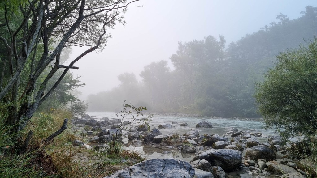 Am nächsten Morgen ziehen Nebelschwaden über den Fluss. Und als die Sonne hinter den Bergen auftaucht und mit voller Wucht den Nebel vertreibt, waten wir mit Bobby durch das eiskalte Wasser der Verdon. Schnell heizt sich die Luft immer weiter auf und wir kriegen einen Vorgeschmack auf die Côte d’Azur, wo es heute definitiv hingehen wird, denn wir haben für die nächste Woche eine Ferienwohnung in Cassis angemietet. Aber erst mal wird gefrühstückt und in die Landschaft geschaut und noch mal durch die Verdon spaziert und irgendwann im Laufe des Tages geht es weiter ans Meer – auf unserem Roadtrip nach Südfrankreich.