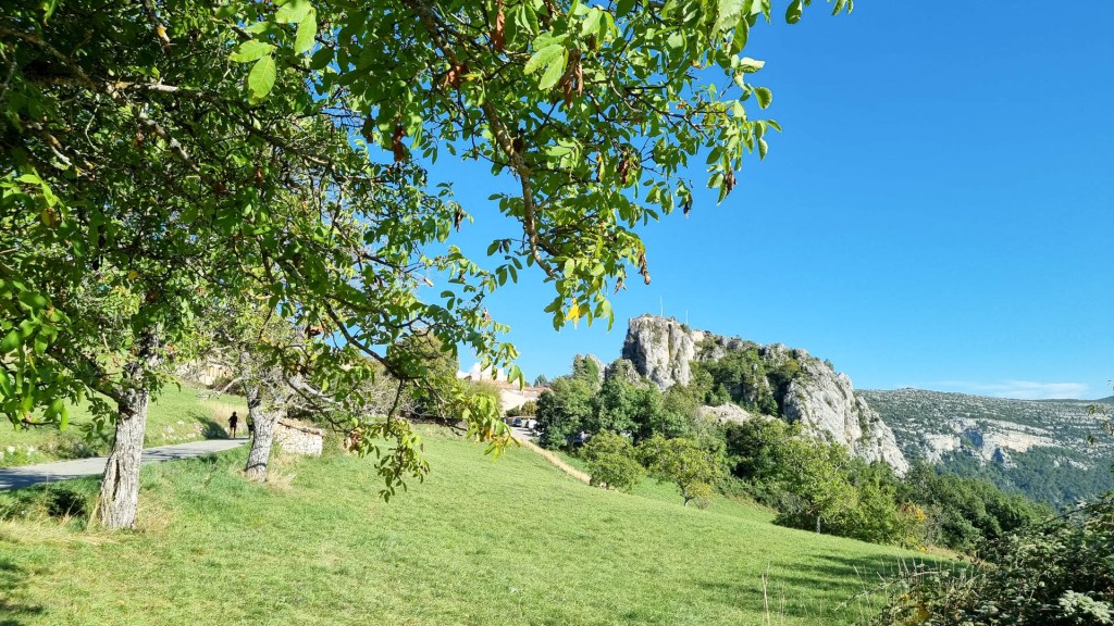 Nach einer Stunde geben wir das Boot wieder ab und folgen weiter den Kringeln auf unserer Landkarte. Wir kurbeln auf immer schmaleren Straßen immer höher und blicken immer tiefer in die Schlucht. Dann erreichen wir saftig, grüne Bergwiesen und den im Sonnenlicht an Felsen geschmiegten Ort Rougon.