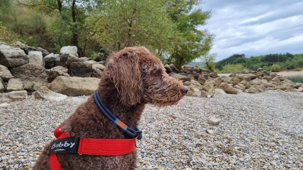 Nach knapp einer Woche sind wir auf unserer Reise nach Südfrankreich an der Verdonschlucht angekommen. Es ist Mitte September und wir sind unterwegs auf unserem ersten längeren Roadtrip mit Hund und Dachzelt. Mittlerweile hat sich eine gewisse Routine eingestellt. So bauten wir nach unserer Ankunft auf dem Campingplatz Les Pins bei Salles du Verdon, am Ufer des Lac de Sainte-Croix, nicht nur unser Schlafzimmer im Dachzelt, sondern vorausschauend auch (obwohl gerade die Sonne schien) die (Regen-) Markise auf, stellten die Stühle und den kleinen Tisch auf, richteten im Kofferraum unser „Badezimmer“ mit Handtüchern und Waschzeug ein, steckten den Kühlschrank an die Powerstation und nutzten die temporäre Sonnenphase, um auch die Solarpanels anzuschließen. Wir waren froh, autark unterwegs zu sein. In den Bereichen, wo es Strom gab, standen auf dem gut besuchten Campingplatz die teilweise riesigen Wohnmobile dicht an dicht. Bobby hat in den letzten (verregneten) Tagen seinen Platz im Kofferraum lieben gelernt. Im Trockenen und mit guter Aussicht von seinem erhöhten Posten beobachtete er entspannt unser Tun und aus den Augenwinkeln den kleinen Yorkshire Terrier, der aus dem Wohnwagentür unserer Nachbarn herauslugte und das Gleiche wie Bobby tat.