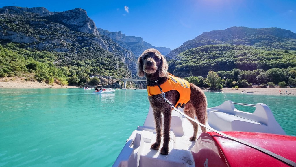 Als hätte jemand in der Nacht einen riesigen Farbeimer über die Landschaft gekippt, so türkisgrün strahlt heute das Wasser des großen Stausees Lac de Sainte-Croix mit dem tiefblauen Himmel um die Wette. Wie kleine bunte Tupfer heben sich die vielen Elektro- und Tretboote vor den kalkweißen und steil aufragenden Felsen der Verdonschlucht ab. Mit der Nase voran steht Bobby am Bug unseres Tretbootes. Eine Bootsfahrt durch die Verdonschlucht, den sogenannten Grand Canyon du Verdon, die sich teilweise bis zu 700 Meter tief in die Landschaft schneidet, hatten wir eigentlich gar nicht geplant – schon gar nicht mit Hund. Zu viele Bedenken wären aufgekommen, hätte ich vorher darüber nachgedacht. Nach sieben Jahren wissen wir immer noch nicht, ob Bobby schwimmen kann. Zum Glück hatten wir seine Schwimmweste eingepackt. Und manchmal passieren die Dinge einfach. Nun bin ich zu überwältigt von unserer Umgebung als dass ich denken könnte. Die Menschen auf den anderen Booten lächeln zu uns rüber und winken Bobby fröhlich zu.