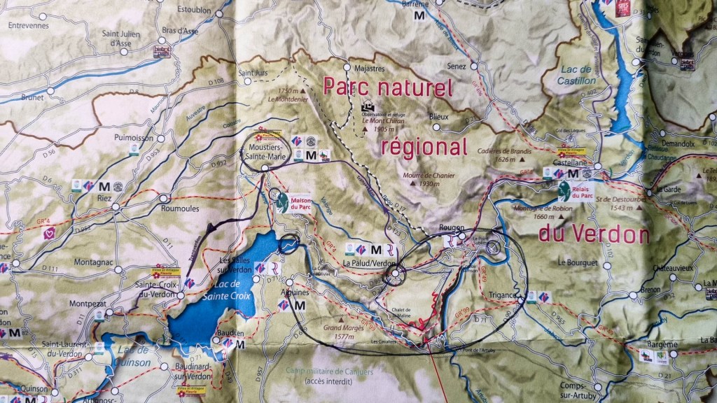 Eigentlich wollten wir nur mal kurz von der großen Brücke aus in die Verdonschlucht blicken. Das war einer der Kringel, die uns die Dame aus der Touristeninfo nach unserem Mittagessen in Les Salles-sur-Verdon auf die Übersichtskarte des Parc naturel regional du Verdon gezeichnet hatte. Das Bergdorf Rougon markierte sie ebenfalls mit dem Hinweis auf eine „très bonne crêperie“, sowie die Route des Crêtes, eine Panoramastraße, die als Einbahnstraße höchst spektakuläre Ausblicke bieten soll. Sie wies darauf hin, dass auf den Wanderwegen in der Verdonschlucht Hunde nicht gestattet seien, gab uns aber einen kleinen, mehrseitigen Prospekt mit dem Titel: „Les Gorges du Verdon avec son chien“ mit, in dem etliche Wanderrouten und Tipps rund um die Verdonschlucht mit Hund aufgeführt sind – ein toller Service, finde ich. Wir planten dennoch keine Wanderung, sondern hatten vor, die empfohlenen Sehenswürdigkeiten mit dem Auto abzuklappern, um dann direkt weiter nach St. Tropez an die Côte d’Azur zu fahren. Wir sehnten uns nach Sonne und Meer.