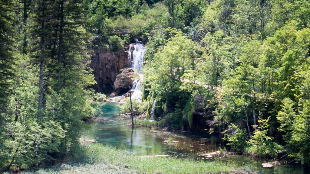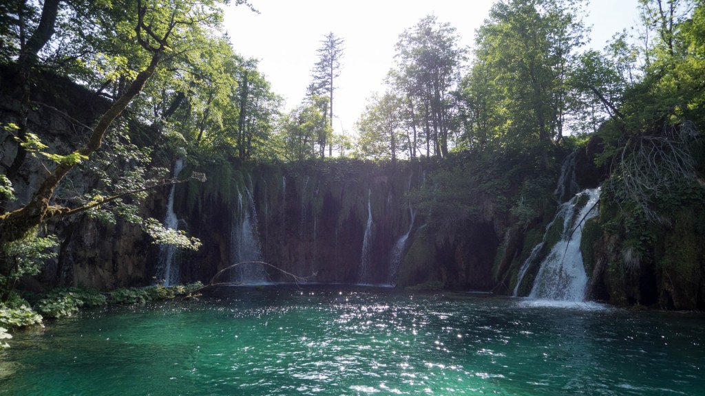 Wir achten nicht mehr auf irgendwelche Wegweiser und laufen kreuz und quer durch die Kaskaden und Barrieren an den oberen Seen. Die Landschaft im Nationalpark verändert sich ständig, lese ich in meinem kleinen Büchlein aus dem Supermarkt als wir auf einer Bank Pause machen. Rauwacke, die sich durch ein Zusammenspiel aus Wasser, Moosen und Algen bildet, setzt sich auf dem kalkhaltigen Gestein oder auch auf abgestorbenen Bäumen ab und so bilden sich immer neue Barrieren. Dahinter staut sich das Wasser und ein See entsteht. Über Jahrmillionen bis heute formt sich die Landschaft auf diese Art faszinierend immer wieder neu. In den ersten Beschreibungen aus dem Jahr 1777 liest man von „fünf schönen Seen im dichtesten Wald an der türkischen Grenze“. Im Jahr 1949 wurden die Plitvicer Seen zum Nationalpark erklärt und 1979 erfolgte die Aufnahme in des UNESCO Weltkulturerbe – was für ein Schatz, den die Natur hier erschafft.
