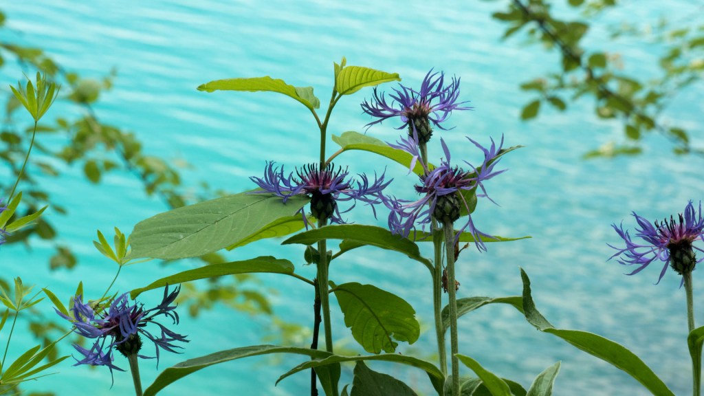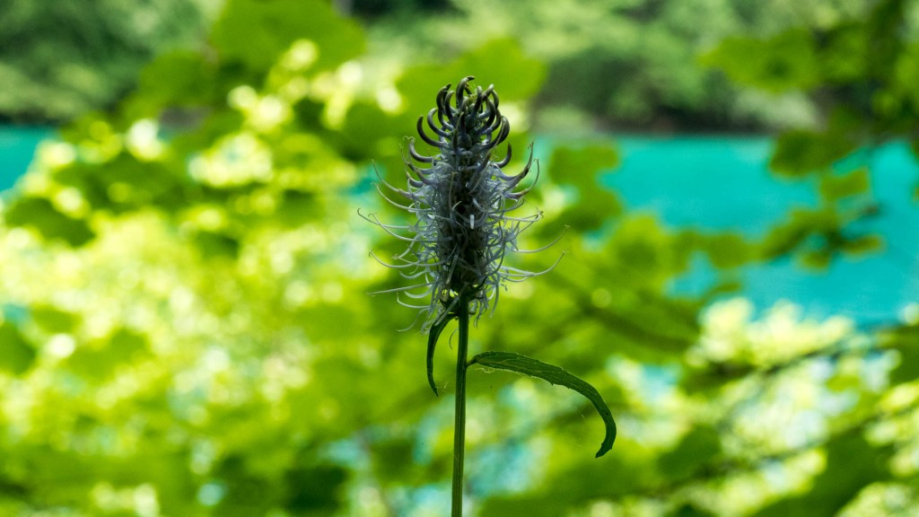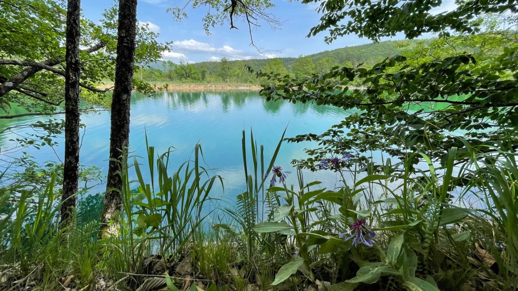 Rechts neben dem Bootsanleger, hinter dem riesigen Gastgarten, überqueren wir eine kleine Holzbrücke und sind unmittelbar von einer wunderbaren Stille umgeben. Auf einem schmalen Weg geht es erst tief unten am Ufer des großen Kozjak Sees entlang und später durch den Wald nach oben, wo wir herrlich schattig die Ausblicke auf den See genießen und die vielen Blumen betrachten. Auch Bobby kann hier nach Herzenslust schnüffeln und an einigen Stellen sogar auch mal die Pfoten ins türkise Wasser strecken. Höchstens eine Handvoll Menschen begegnen wir auf der Runde um den Kozjak See und ich rechne kurz durch: selbst wenn in der Hauptsaison doppelt so viele Menschen im Nationalpark Plitvicer Seen sind, dann kommt man hier auf den knapp vier Kilometern entlang des Sees auf 10 Menschen. Ich wage zu behaupten, hier ist man immer recht einsam unterwegs – ideal gerade auch mit Hund. Wir atmen durch und wir lassen uns Zeit. Wir machen Picknick und sammeln Kraft für die belebteren Abschnitte, die ja auch wieder kommen werden.