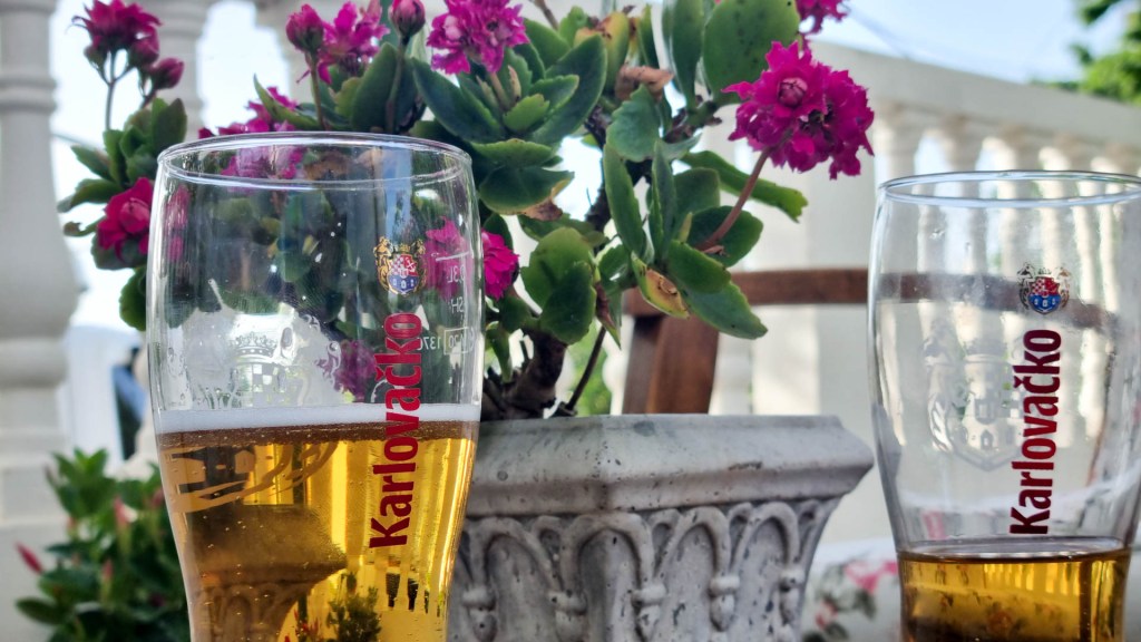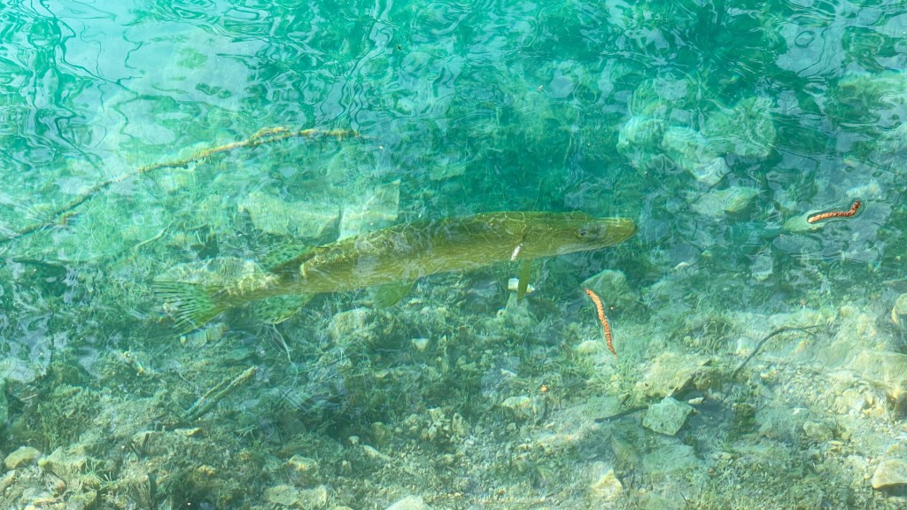 Irgendwann erreichen wir den Bootsanleger am großen See und nach gut 13 Kilometern und über 500 Höhenmetern beschließen wir, das Boot zu nehmen. Es ist bereits später Nachmittag als wir auf der anderen Seite des Kozjak Sees an den großen Schnellrestaurants anlegen. Es ist kaum noch etwas los. „Wie wäre es mit einem kühlen Bierchen?“ schlägt Wolfgang vor. Was für eine gute Idee! Mit zwei Bierdosen kommt er kurze Zeit später wieder und berichtet, dass die Restaurants von innen genauso lieblos wie von draußen aussehen. Aber egal: Das Kaltgetränk schmeckt. Bobby schläft im Schatten und als wir ihn wecken, werden bereits die Böden von der Terrasse gewischt. Wir sind die letzten Gäste. Entlang der unteren Seen gehen wir Richtung Eingang 1, die Sonne steht tief und taucht die Landschaft in ein warmes Licht. Von den Stegen entlang der Kalksteinfelsen schauen wir in das stille und glasklare Wasser und entdecken einige Hechte, um dann wieder rauschende Kaskaden und wilde Wasserfälle zu passieren. Wow, so schön hatte ich diese Passage auf dem Hinweg gar nicht in Erinnerung.