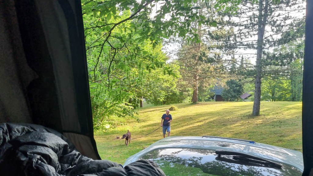 Beim Campen vergeht bei uns besonders morgens viel Zeit bis wir mit allem fertig sind: wach werden, einen ersten Kaffee auf dem Dach trinken, Gassirunde mit Bobby drehen, Brötchen holen, duschen gehen, ausgiebig frühstücken, zwischendurch immer wieder im Auto herumräumen oder einfach in die Gegend gucken. Ich liebe diese langsame Gangart, die mir im Alltag so schwerfällt. Deswegen haben wir uns gar nicht erst vorgenommen, möglichst früh, wie es vielfach wegen des Besucheransturms empfohlen wird, an den Plitvicer Seen zu sein. Aber es ist Ende Mai, das ist die Zeit der längsten Tage, und der Nationalpark hat noch bis 20 Uhr geöffnet.